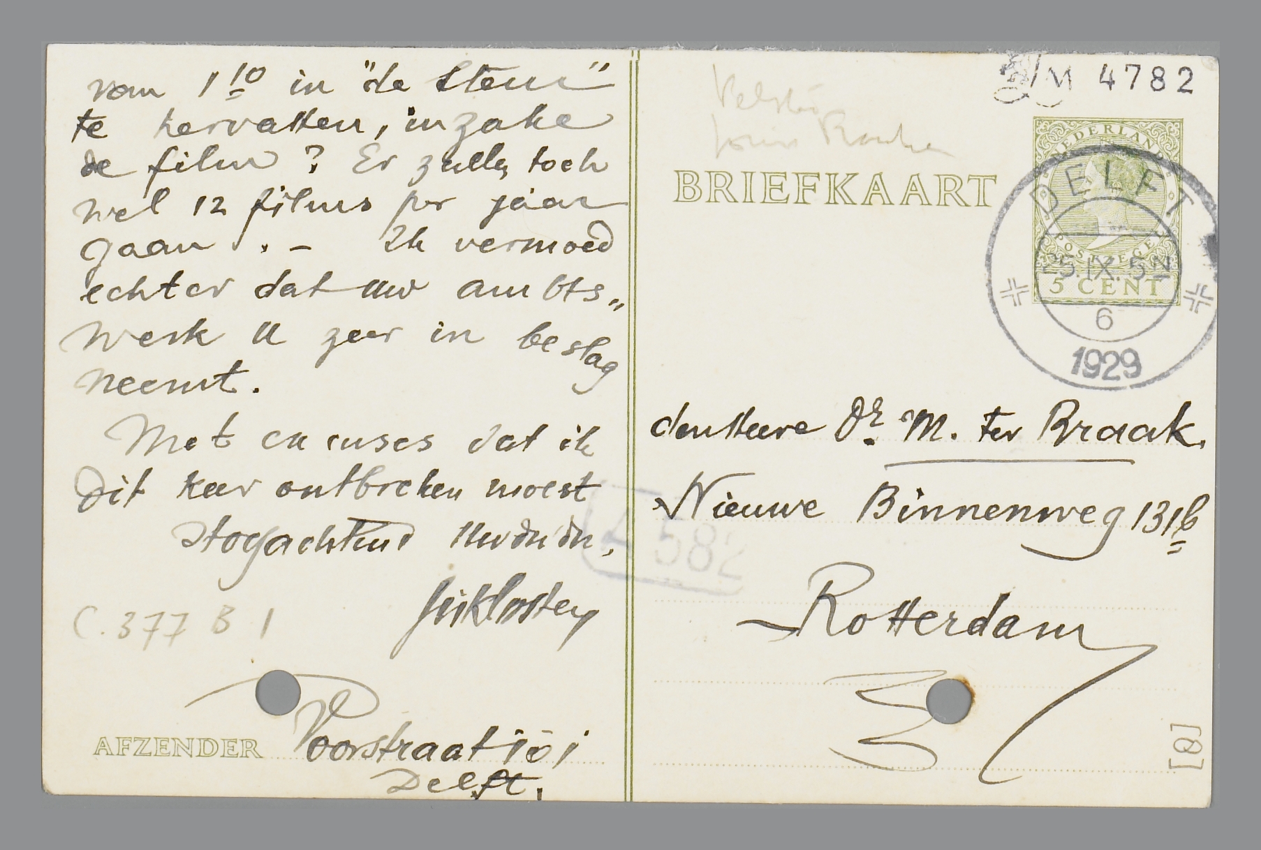 In Oct. verschijnt in ‘de Stem’ een uitvoerige bespreking van Uw boek. Voelt U er niet voor, Uw maandkroniek van I10 in ‘de Stem’ te hervatten, inzake de film? Er zullen toch wel 12 films per jaar gaan. - Ik vermoed echter dat uw ambtswerk U zeer in beslag neemt.