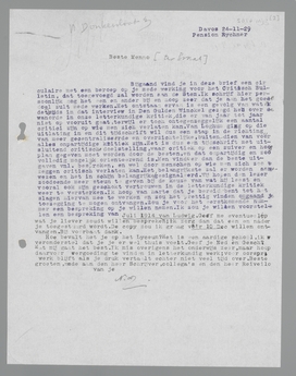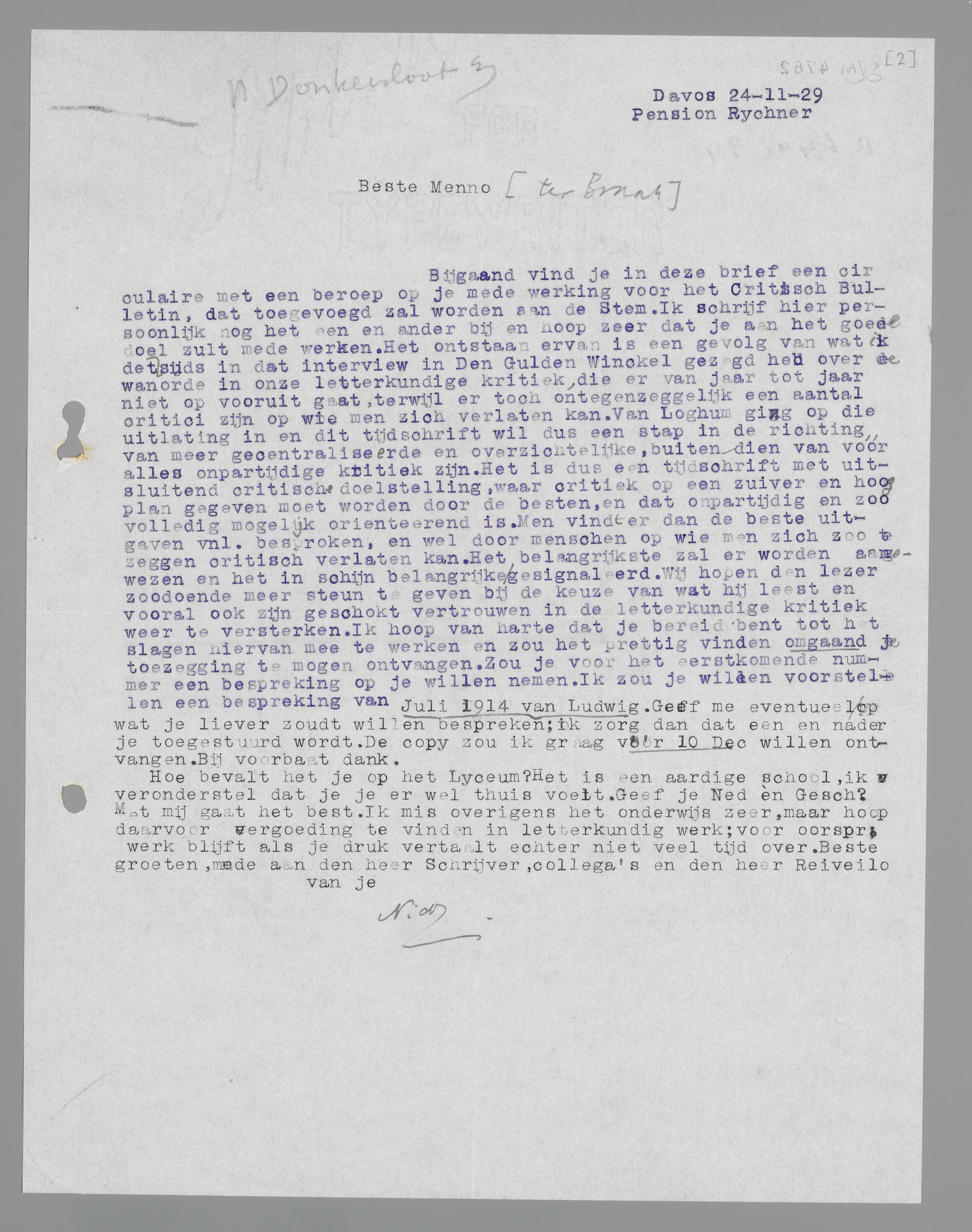 Bijgaand vind je in deze brief een circulaire met een beroep op je mede werking voor het ‘Critisch Bulletin’, dat toegevoegd zal worden aan de ‘Stem’. Ik schrijf hier persoonlijk nog het een en ander bij en hoop zeer dat je aan het goede doel zult mede werken. Het ontstaan ervan is een gevolg van wat ik destijds in dat interview in ‘Den Gulden Winckel’ gezegd heb over de wanorde in onze letterkundige kritiek, die er van jaar tot jaar niet op vooruit gaat, terwijl er toch ontegenzeggelijk een aantal critici zijn op wie men zich verlaten kan. Van Loghum ging op die uitlating in en dit tijdschrift en dit tijdschrift wil dus een stap in de richting van meer gecentraliseerde en overzichtelijke, buitendien van voor alles onpartijdige kritiek zijn. Het is dus een tijdschrift met uitsluitend critische doelstelling, waar critiek op een zuiver en hoog plan gegeven moet worden door de besten, en dat onpartijdig en zoo volledig mogelijk orienteerend is. Men vindt er dan de beste uitgaven vnl. besproken, en wel door menschen op wie men zich zoo te zeggen critisch verlaten kan. Het belangrijkste zal er worden aangewezen en het in schijn belangrijke gesignaleerd. Wij hopen den lezer zoodoende meer steun te geven bij de keuze van wat hij leest en vooral ook zijn geschokt vertrouwen in de letterkundige kritiek weer te versterken. Ik hoop van harte dat je bereid bent tot het slagen hiervan mee te werken en zou het prettig vinden omgaand je toezegging te mogen ontvangen. Zou je voor het eerstkomende nummer een bespreking op je willen nemen. Ik zou je willen voorstellen een bespreking van Juli 1914 van Ludwig. Geef me eventueel op wat je liever zoudt willen bespreken; ik zorg dan dat een en ander je toegestuurd wordt. De copy zou ik graag voor 10 Dec willen ontvangen. Bij voorbaat dank.