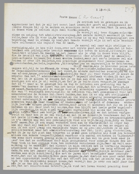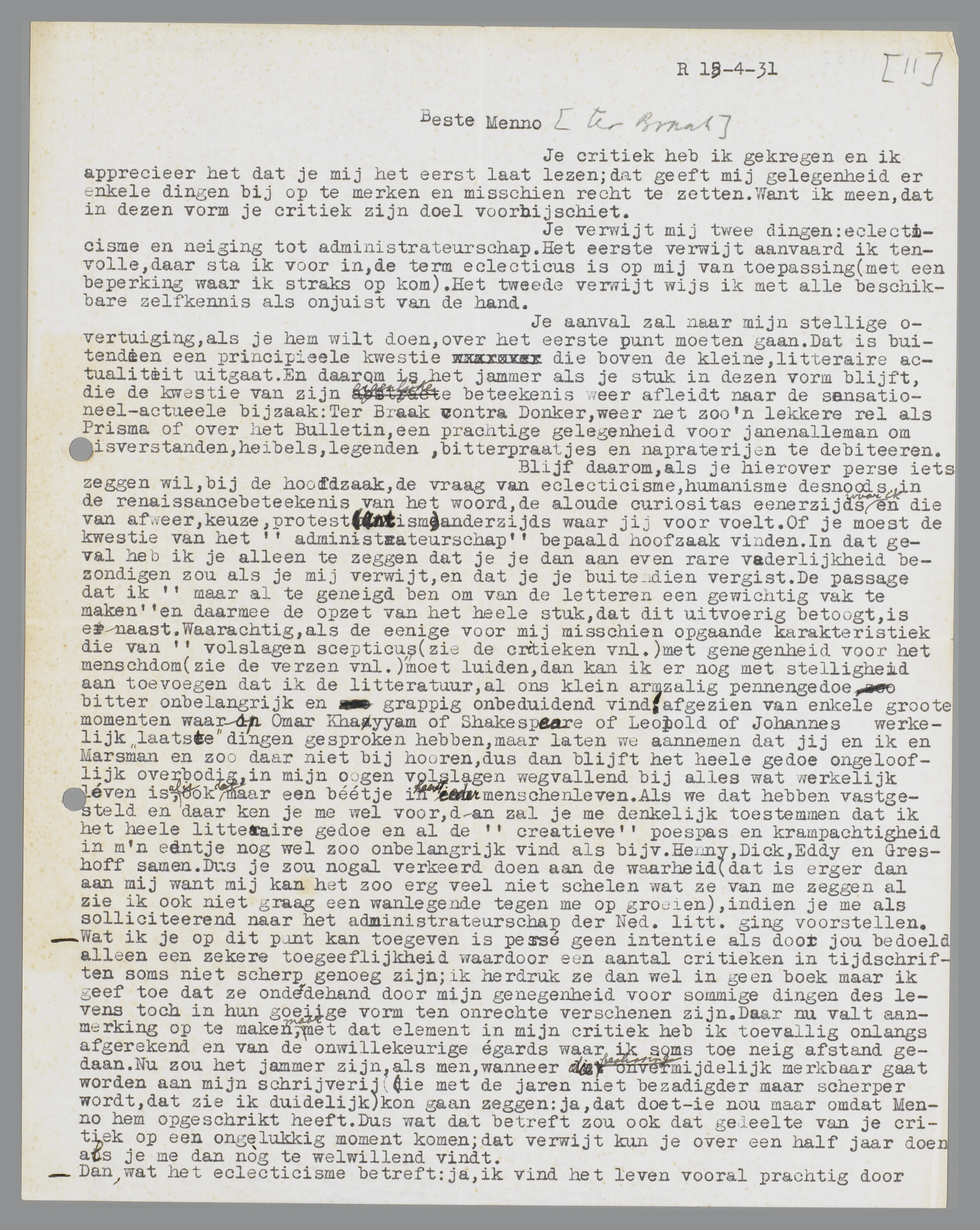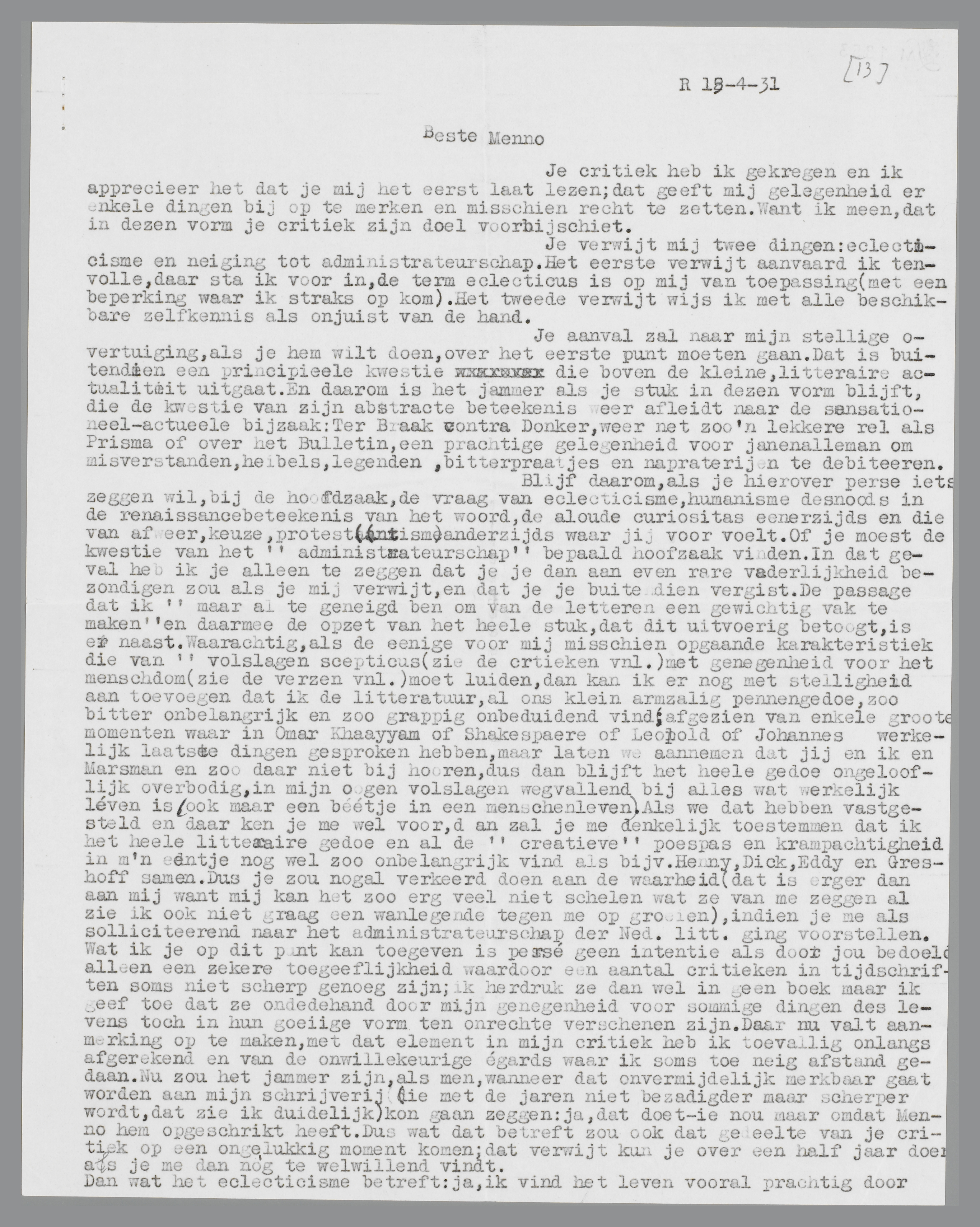 Je aanval zal naar mijn stellige overtuiging, als je hem wilt doen, over het eerste punt moeten gaan. Dat is buitendien een principieele kwestie die boven de kleine, litteraire actualiteit uitgaat. En daarom is het jammer als je stuk in dezen vorm blijft, die de kwestie van zijn eigenlijke beteekenis weer afleidt naar de sensationeel-actueele bijzaak: Ter Braak contra Donker, weer net zoo'n lekkere rel als Prisma of over het Bulletin, een prachtige gelegenheid voor janenalleman om misverstanden, heibels, legenden, bitterpraatjes en napraterijen te debiteeren.
