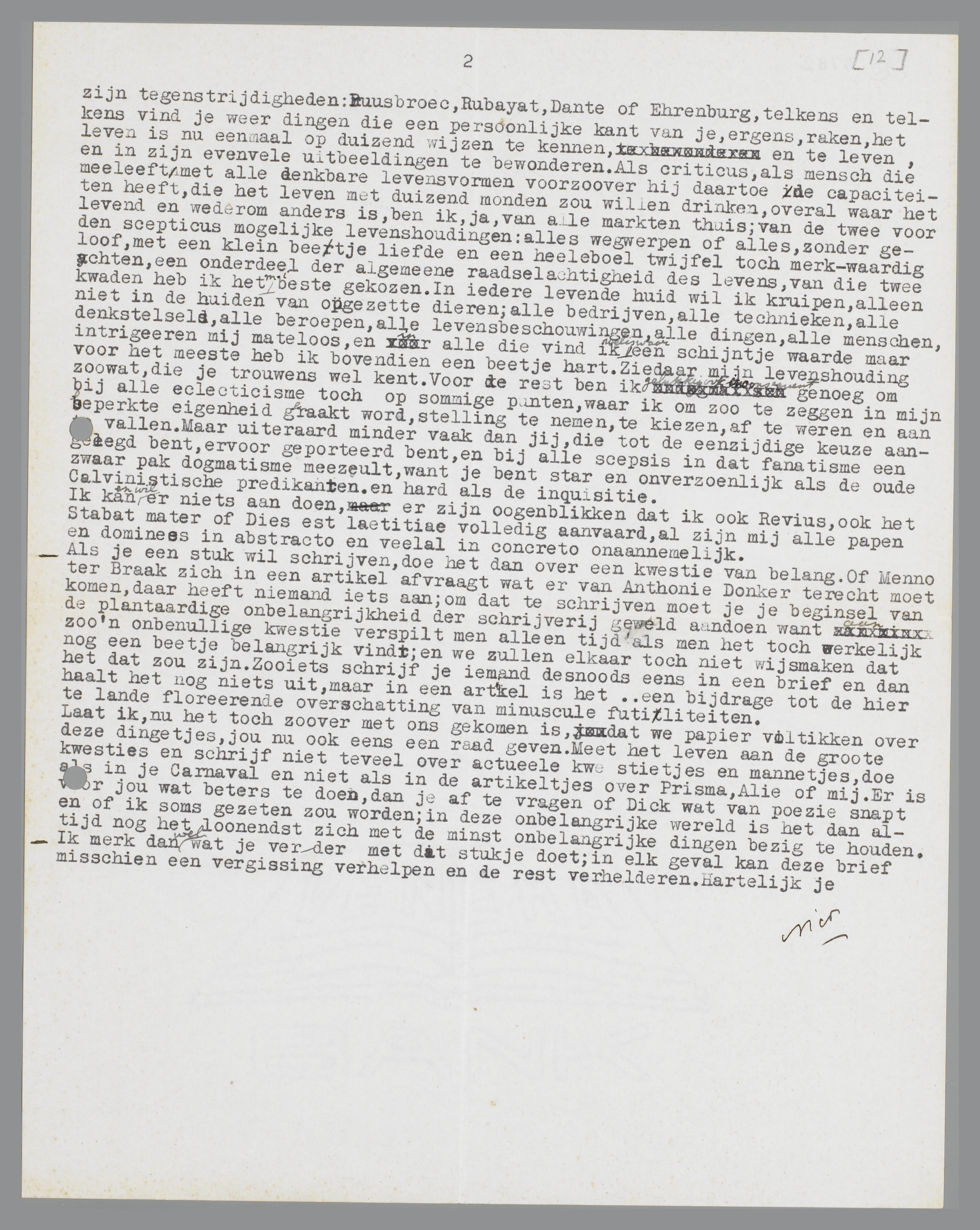 Dan wat het eclecticisme betreft: ja, ik vind het leven vooral prachtig door zijn tegenstrijdigheden: Ruusbroec, Rubayat, Dante of Ehrenburg, telkens en telkens vind je weer dingen die een persoonlijke kant van je, ergens, raken, het leven is nu eenmaal op duizend wijzen te kennen, en te leven, en in zijn evenvele uitbeeldingen te bewonderen. Als criticus, als mensch die meeleeft met alle denkbare levensvormen voorzoover hij daartoe de capaciteiten heeft, die het leven met duizend monden zou willen drinken, overal waar het levend en wederom anders is, ben ik, ja, van alle markten thuis; van de twee voor den scepticus mogelijke levenshoudingen: alles wegwerpen of alles, zonder geloof, met een klein beetje liefde en een heeleboel twijfel toch merk-waardig achten, een onderdeel der algemeene raadselachtigheid des levens, van die twee kwaden heb ik het [m.i.] beste gekozen. In iedere levende huid wil ik kruipen, alleen niet in de huiden van opgezette dieren; alle bedrijven, alle technieken, alle denkstelsels, alle beroepen, alle levensbeschouwingen, alle dingen, alle menschen, intrigeeren mij mateloos, en in alle die vind ik weliswaar een schijntje waarde maar voor het meeste heb ik bovendien een hart. Ziedaar mijn levenshouding zoowat, die je trouwens wel kent. Voor de rest ben ik gelukkig ook inconsequent genoeg om bij alle eclecticisme toch op sommige punten, waar ik om zoo te zeggen in mijn beperkte eigenheid geraakt word, stelling te nemen, te kiezen, af te weren en aan te vallen. Maar uiteraard minder vaak dan jij, die tot de eenzijdige keuze aangelegd bent, ervoor geporteerd bent, en bij alle scepsis in dat fanatisme een zwaar pak dogmatisme meezeult, want je bent star en onverzoenlijk als de oude Calvinistische predikanten en hard als de inquisitie.