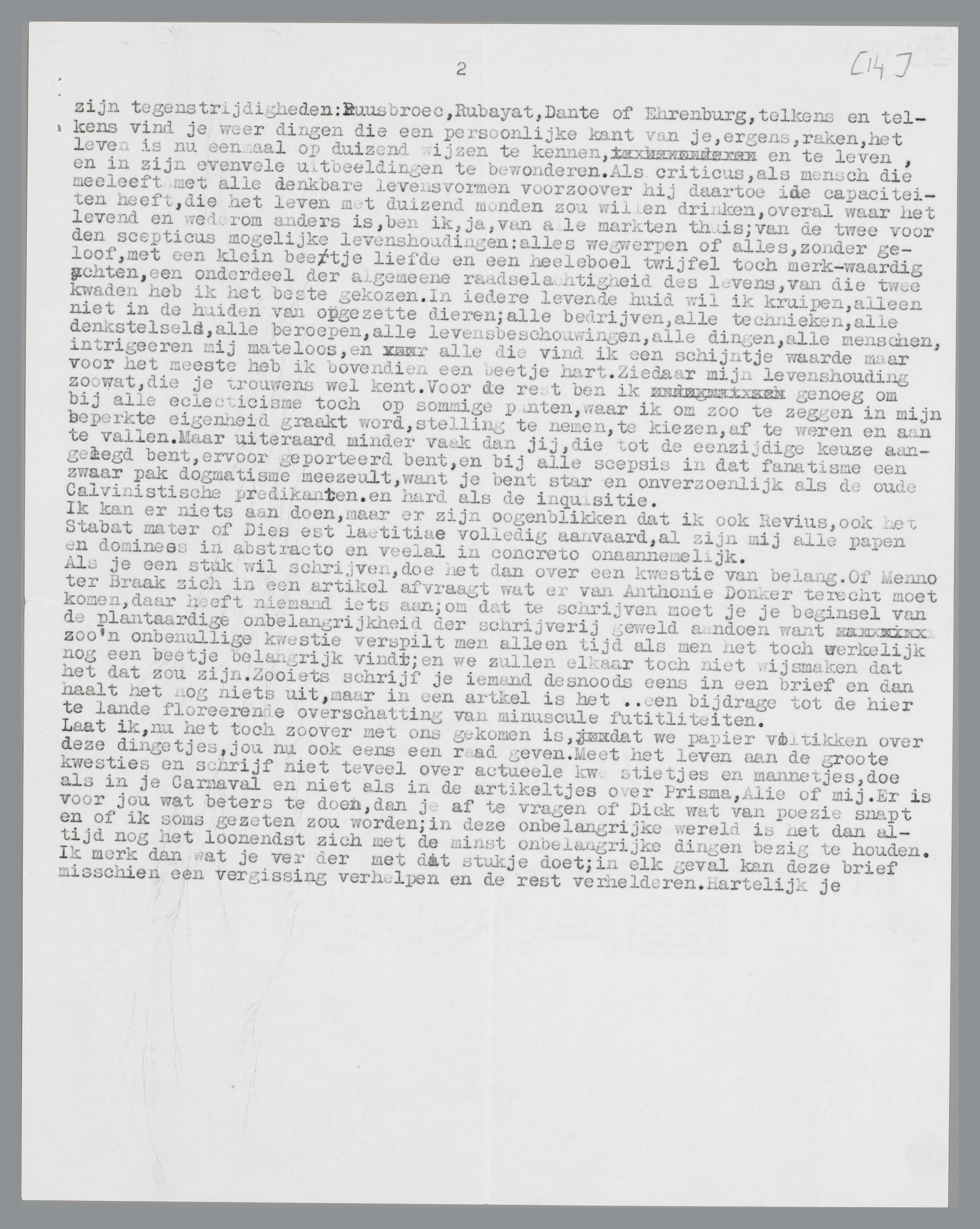 Laat ik, nu het toch zoover met ons gekomen is, dat we papier voltikken over deze dingetjes, jou nu ook eens een raad geven. Meet het leven aan de groote kwesties en schrijf niet teveel over actueele kwestietjes en mannetjes, doe als in je Carnaval en niet als in de artikeltjes over Prisma, Alie of mij. Er is voor jou wat beters te doen, dan je af te vragen of Dick wat van poezie snapt en of ik soms gezeten zou worden; in deze onbelangrijke wereld is het dan altijd nog het loonendst zich met de minst onbelangrijke dingen bezig te houden.