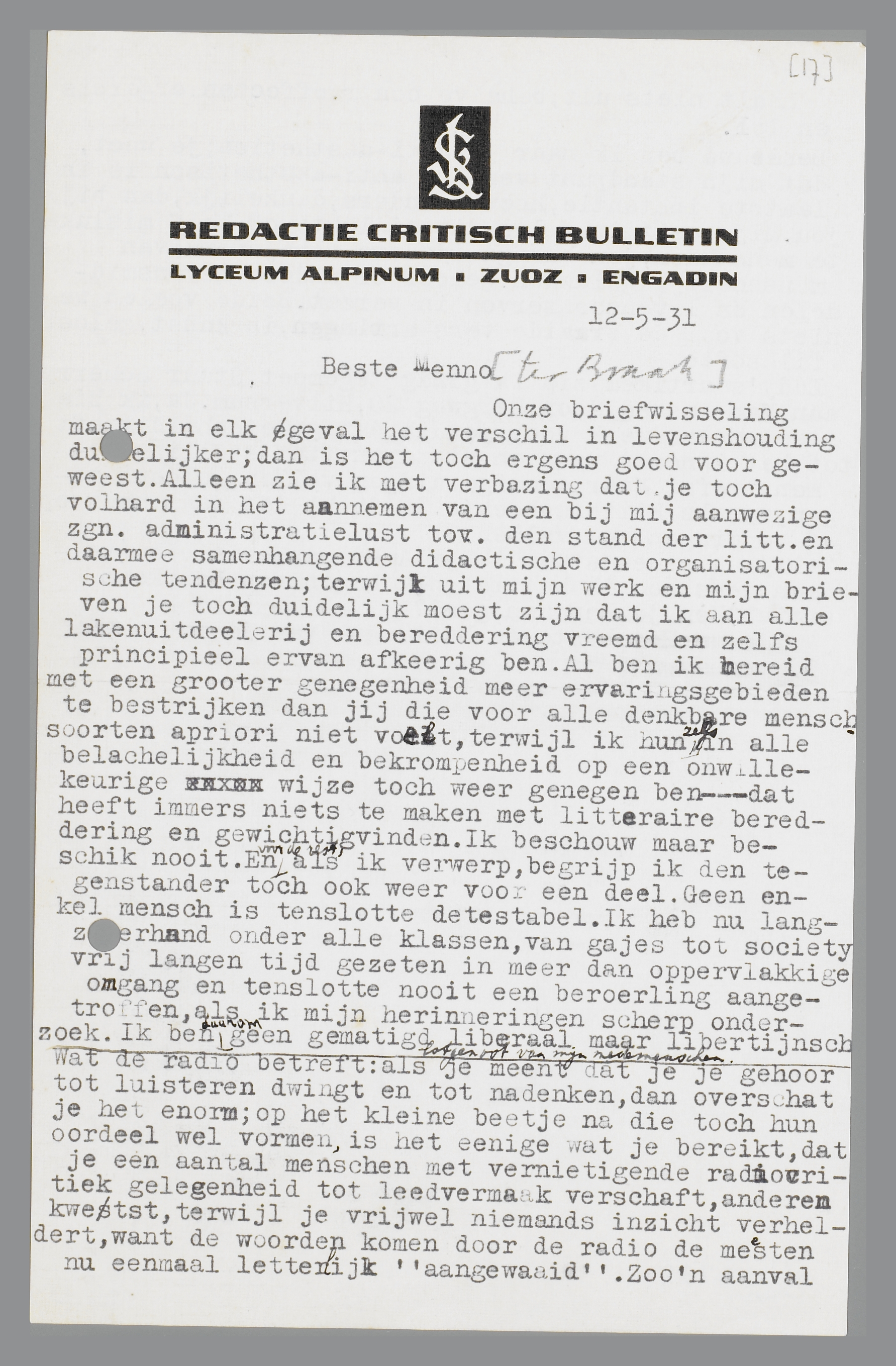 Onze briefwisseling maakt in elk geval het verschil in levenshouding duidelijker; dan is het toch ergens goed voor geweest. Alleen zie ik met verbazing dat je toch volhard in het aannemen van een bij mij aanwezige zgn. administratielust tov. den stand der litt. en daarmee samenhangende didactische en organisatorische tendenzen; terwijl uit mijn werk en brieven je toch duidelijk moest zijn dat ik aan alle lakenuitdeelderij en bereddering vreemd en zelfs principieel ervan afkeerig ben. Al ben ik bereid met een grooter genegenheid meer ervaringsgebieden te bestrijken dan jij die voor alle denkbare menschsoorten apriori niet voelt, terwijl ik hun zelfs in alle belachelijkheid en bekrompenheid op een onwillekeurige wijze toch weer genegen ben - dat heeft immers niets te maken met litteraire bereddering en gewichtig vinden. Ik beschouw maar ik beschik nooit. En voor de rest als ik verwerp, begrijp ik den tegenstander toch ook weer voor een deel. Geen enkel mensch is tenslotte detestabel. Ik heb nu langzamerhand onder alle klassen, van gajes tot society vrij langen tijd gezeten in meer dan oppervlakkige omgang en tenslotte nooit een beroerling aangetroffen, als ik mijn herinneringen scherp onderzoek. Ik ben daarom geen gematigd lotgenoot van mijn medemenschen, liberaal maar libertijnsch.