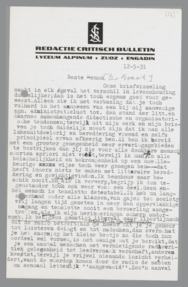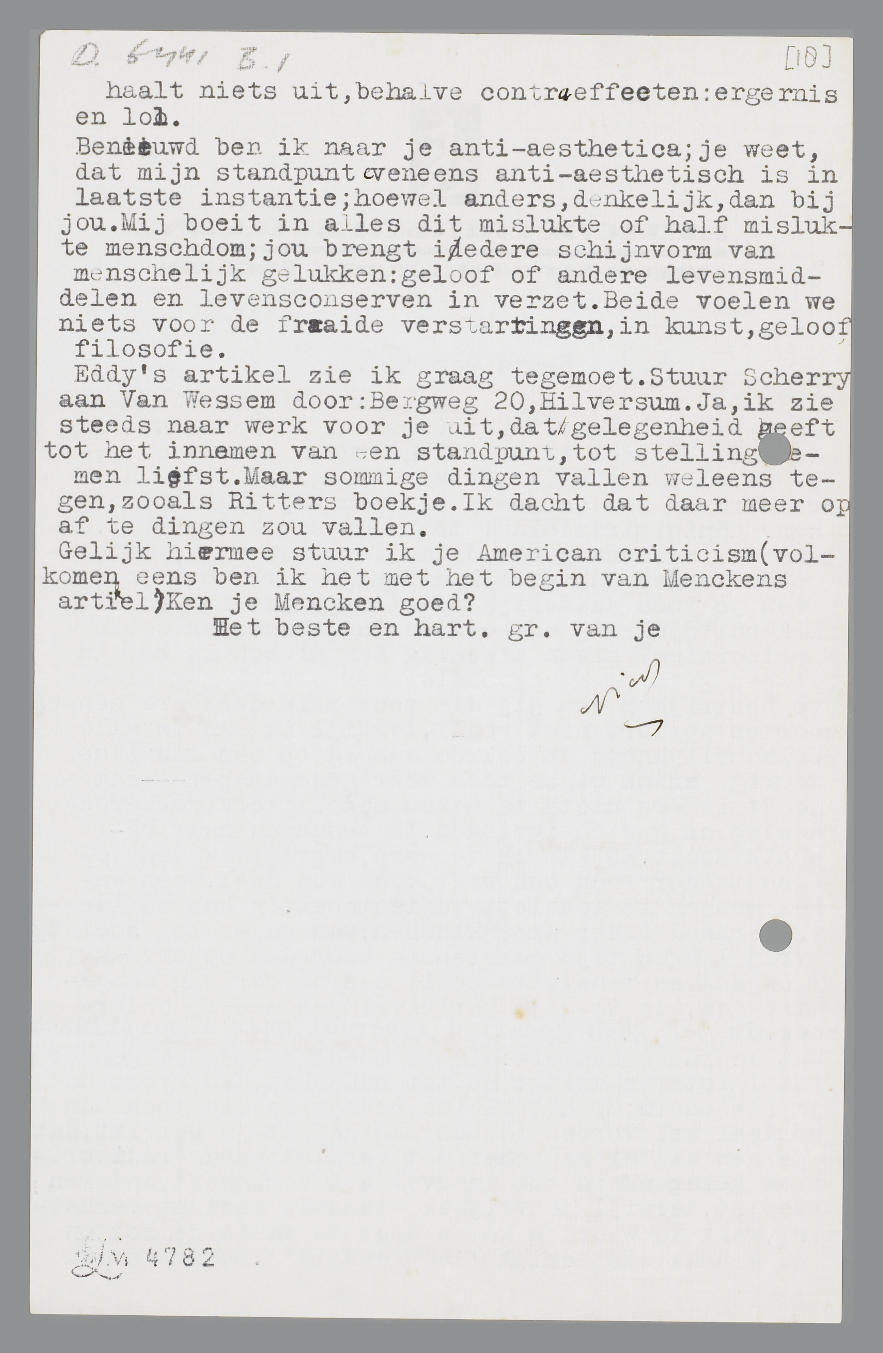 Eddy's artikel zie ik graag tegemoet. Stuur Scherry aan Van Wessem door: Bergweg 20, Hilversum. Ja, ik zie steeds naar werk je uit, dat gelegenheid heeft tot het innemen van een standpunt, tot stelling nemen liefst. Maar sommige dingen vallen weleens tegen, zooals Ritters boekje. Ik dacht dat daar meer op af te dingen zou vallen.
