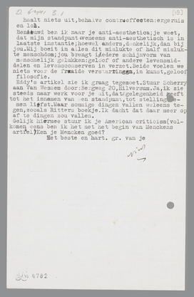 Benieuwd ben ik naar je anti-aesthetica; je weet, dat mijn standpunt eveneens anti-aesthetisch is in laatste instantie; hoewel anders, denkelijk, dan bij jou. Mij boeit in alles dit mislukte of half mislukte menschdom; jou brengt iedere schijnvorm van menschelijk gelukkken: geloof of andere levensmiddelen en levensconserven in verzet. Beide voelen we niets voor de fraaie verstarringen, in kunst, geloof, filosofie.