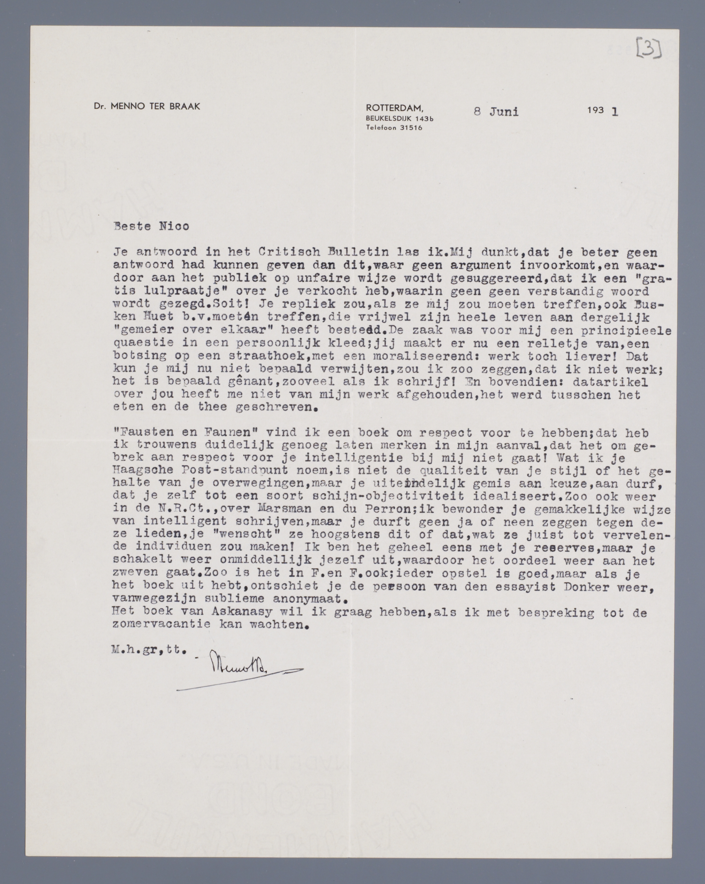 ‘Fausten en Faunen’ vind ik een boek om respect voor te hebben; dat heb ik trouwens duidelijk genoeg laten merken in mijn aanval, dat het om gebrek aan respect voor je intelligentie bij mij niet gaat! Wat ik je Haagsche Post-standpunt noem, is niet de qualiteit van je stijl of het gehalte van je overwegingen, maar je uiteindelijk gemis aan keuze, aan durf, dat je zelf tot een soort schijn-objectiviteit idealiseert. Zoo ook weer in de N.R. Ct., over Marsman en Du Perron; ik bewonder je gemakkelijke wijze van intelligent schrijven, maar je durft geen ja of neen zeggen tegen deze lieden, je ‘wenscht’ ze hoogstens dit of dat, wat ze juist tot vervelende individuen zou maken! Ik ben het geheel eens met je reserves, maar je schakelt weer onmiddellijk jezelf uit, waardoor het oordeel weer aan het zweven gaat. Zoo is het in F. en F. ook; ieder opstel is goed, maar als je het boek uit hebt, ontschiet je de persoon van den essayist Donker weer vanwege zijn sublieme anonymaat.