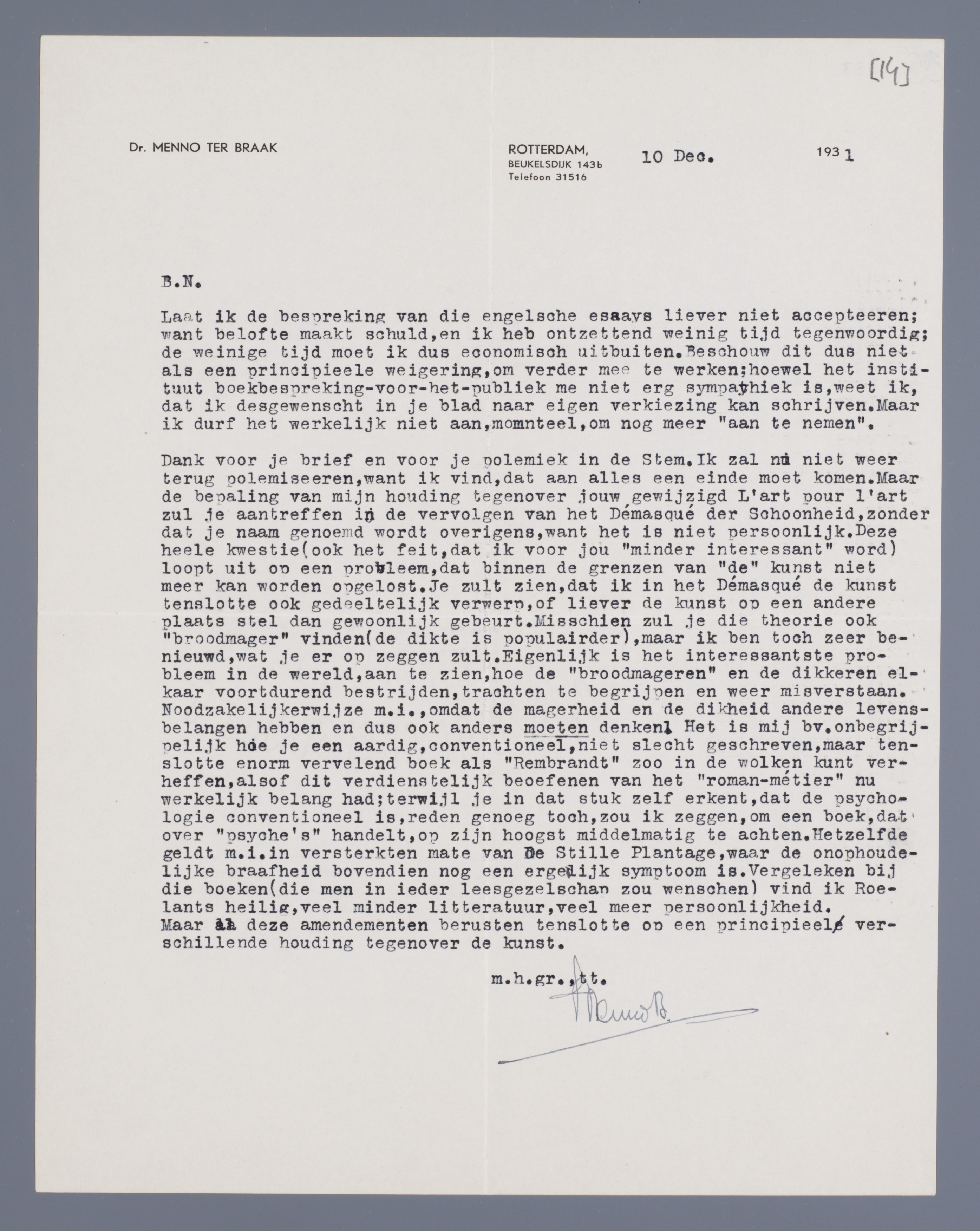 Laat ik de bespreking van die engelsche essays liever niet accepteren; want belofte maakt schuld, en ik heb ontzettend weinig tijd tegenwoordig; de weinige tijd die ik heb moet ik dus economisch uitbuiten. Beschouw dit dus niet las een principieele weigering, om verder mee te werken; hoewel het instituut boekbespreking-voor-het-publiek me niet erg sympahtiek is, weet ik, dat ik desgewenscht in je blad naar eigen verkiezing kan schrijven. Maar ik durf het werkelijk niet aan, momenteel, om nog meer ‘aan te nemen’.