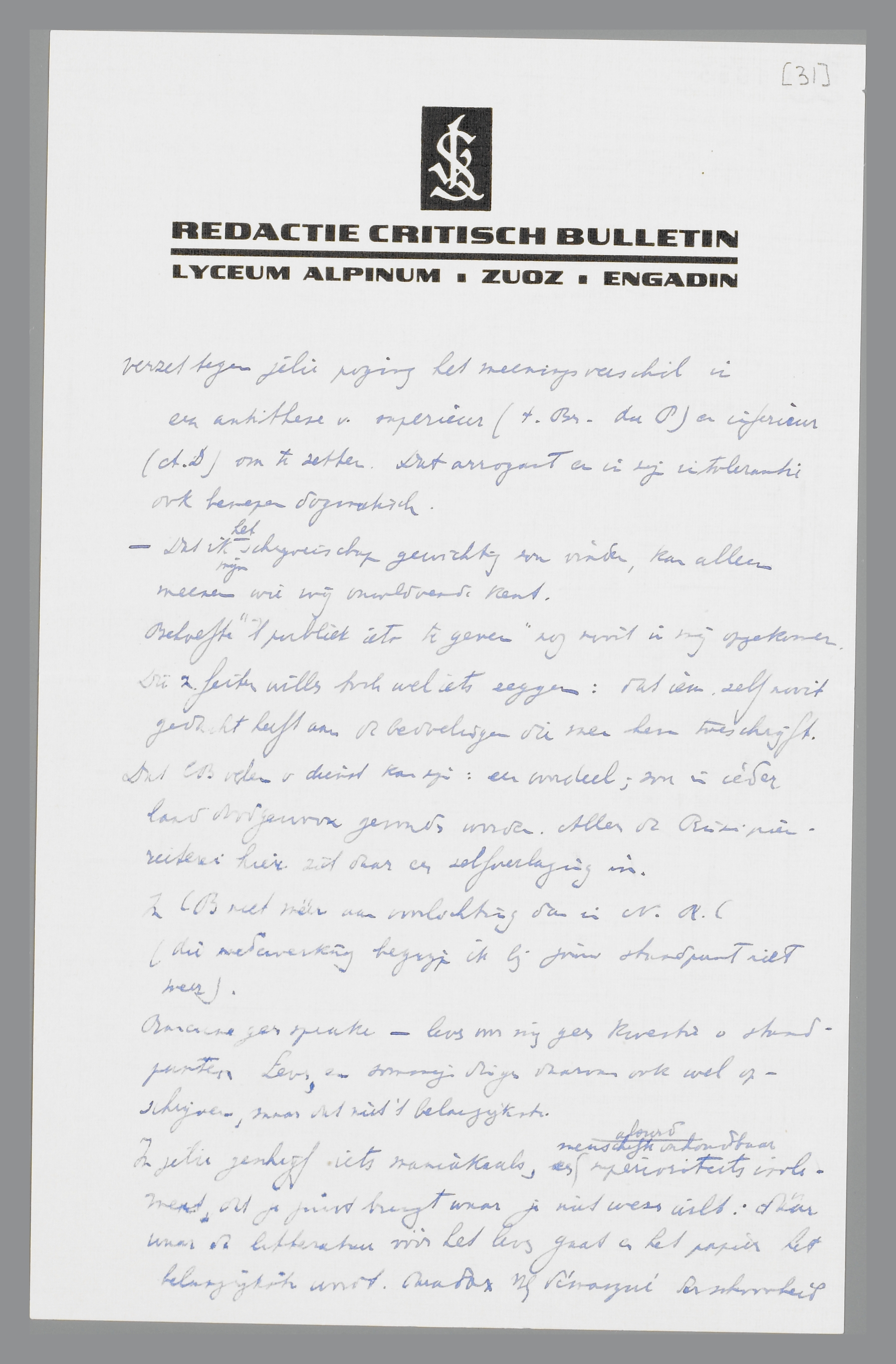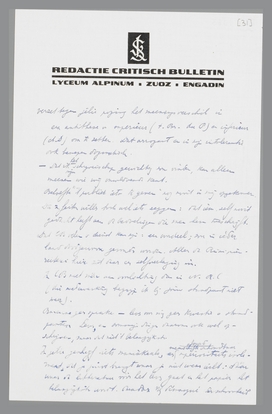 In jullie geschrijf iets maniakaals, een menschelijk onhoudbaar absurd superioriteits isolement, dat je juist brengt waar je niet wezen wilt: daar waar de litteratuur vòòr het leven gaat en het papier het belangrijkste wordt. Paradox [vh] démasqué der schoonheid is, dat de verloochening der litteratuur een nieuw litteratendom wordt.