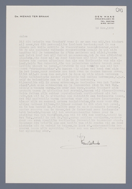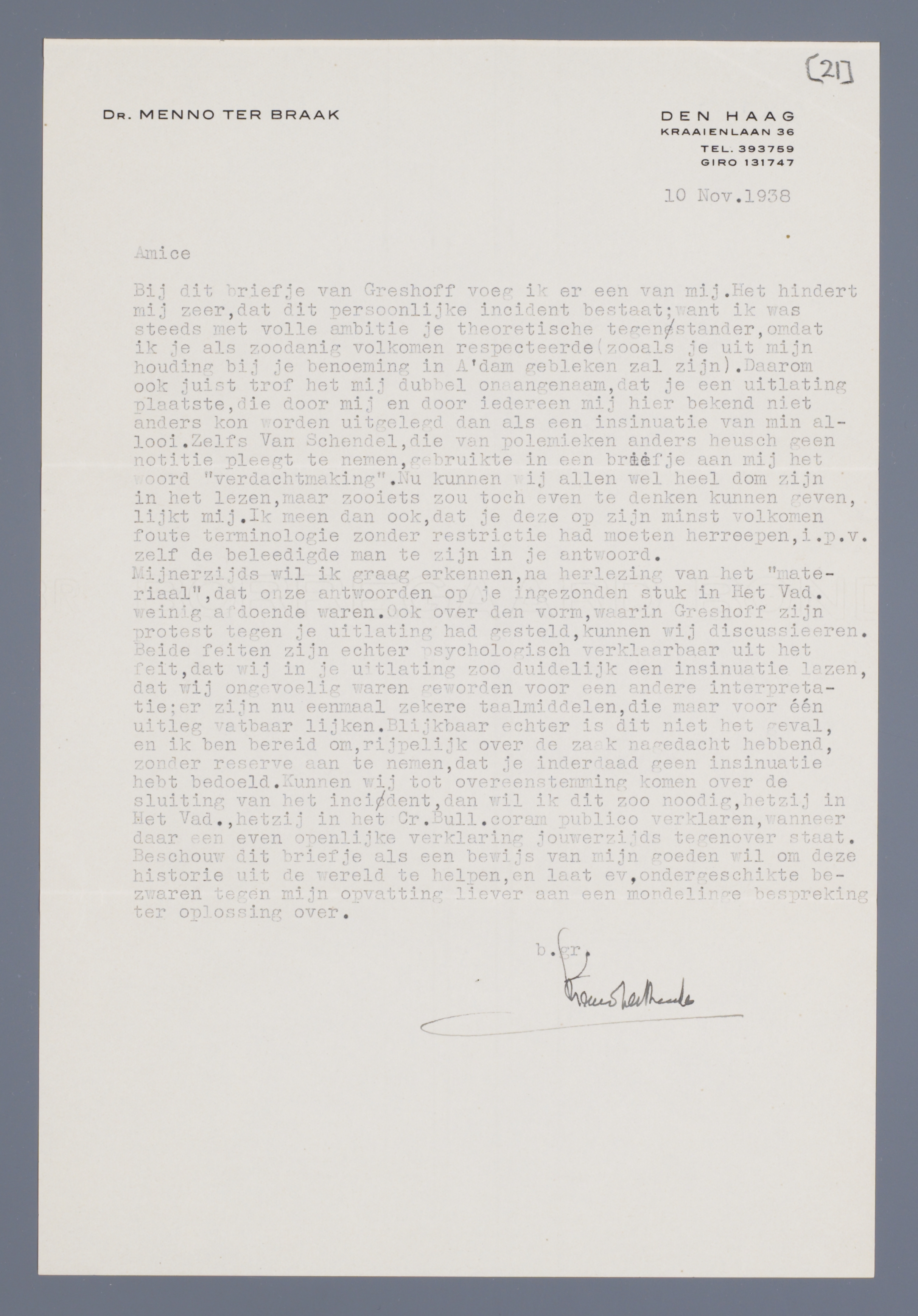 Mijnerzijds wil ik graag erkennen, na herlezing van het ‘materiaal’, dat onze antwoorden op je ingezonden stuk in Het Vad. weinig afdoende waren. Ook over den vorm, waarin Greshoff zijn protest tegen je uitlating had gesteld, kunnen wij discussieeren. Beide feiten zijn echter psychologisch verklaarbaar uit het feit, dat wij in je uitlating zoo duidelijk een insinuatie lazen, dat wij ongevoelig waren geworden voor een andere interpretatie; er zijn nu eenmaal zekere taalmiddelen, die maar voor één uitleg vatbaar lijken. Blijkbaar echter is dit niet het geval, en ik ben bereid om, rijpelijk over de zaak nagedacht hebbend, zonder reserve aan te nemen, dat je inderdaad geen insinuatie hebt bedoeld. Kunnen wij tot overeenstemming komen over de sluiting van het incident, dan wil ik dit zoo nodig, hetzij in Het Vad., het zij in het Cr. Bull. coram publico verklaren, wanneer daar een even openlijke verklaring jouwerzijds tegenover staat. Beschouw dit briefje als een bewijs van mijn goeden wil om deze historie uit de wereld te helpen, en laat ev. ondergeschikte bezwaren over mij opvatting liever aan een mondelinge bespreking ter oplossing over.