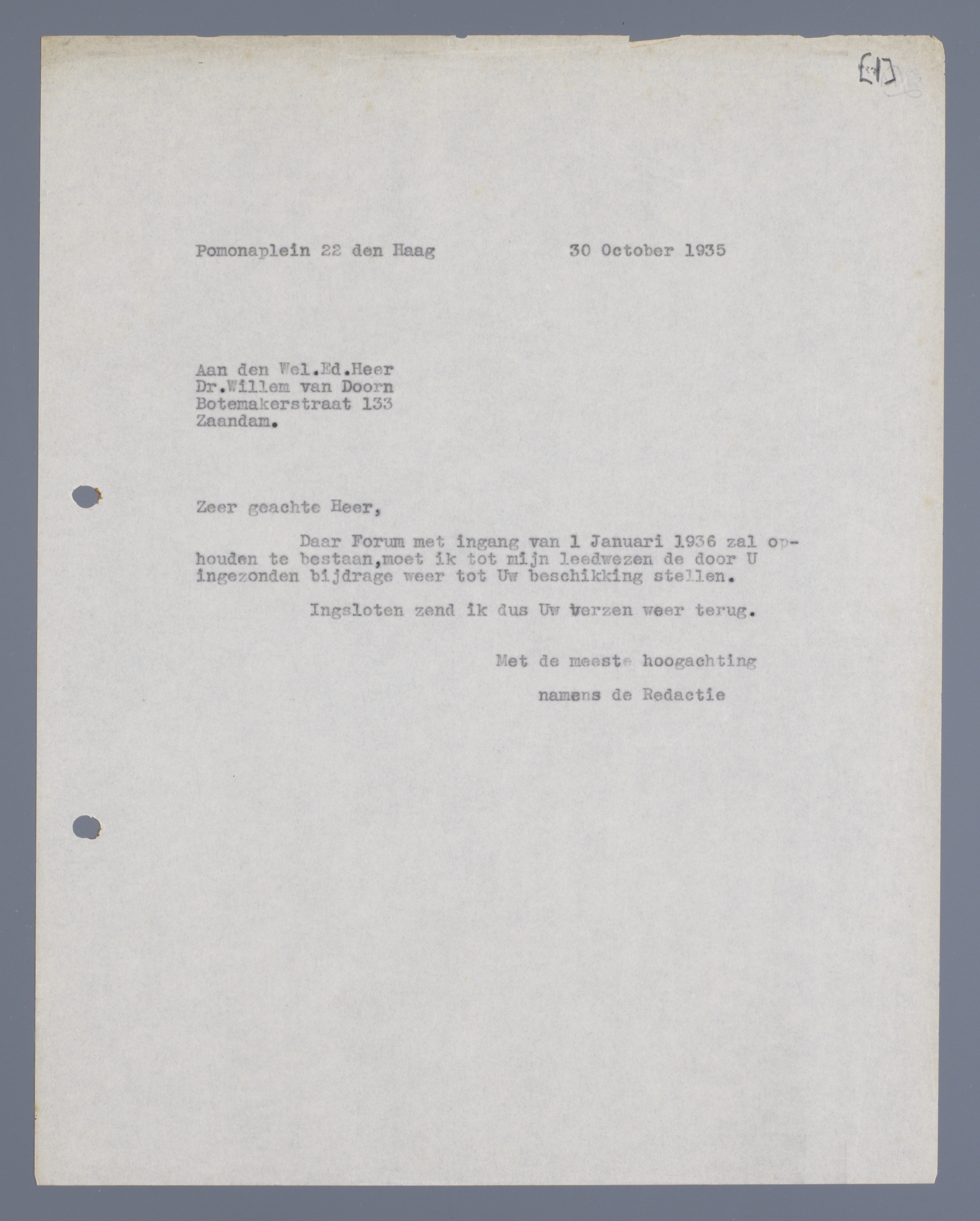 Daar Forum met ingang van 1 Januari 1936 zal ophouden te bestaan, moet ik tot mijn leedwezen de door U ingezonden bijdrage weer tot Uw beschikking stellen.