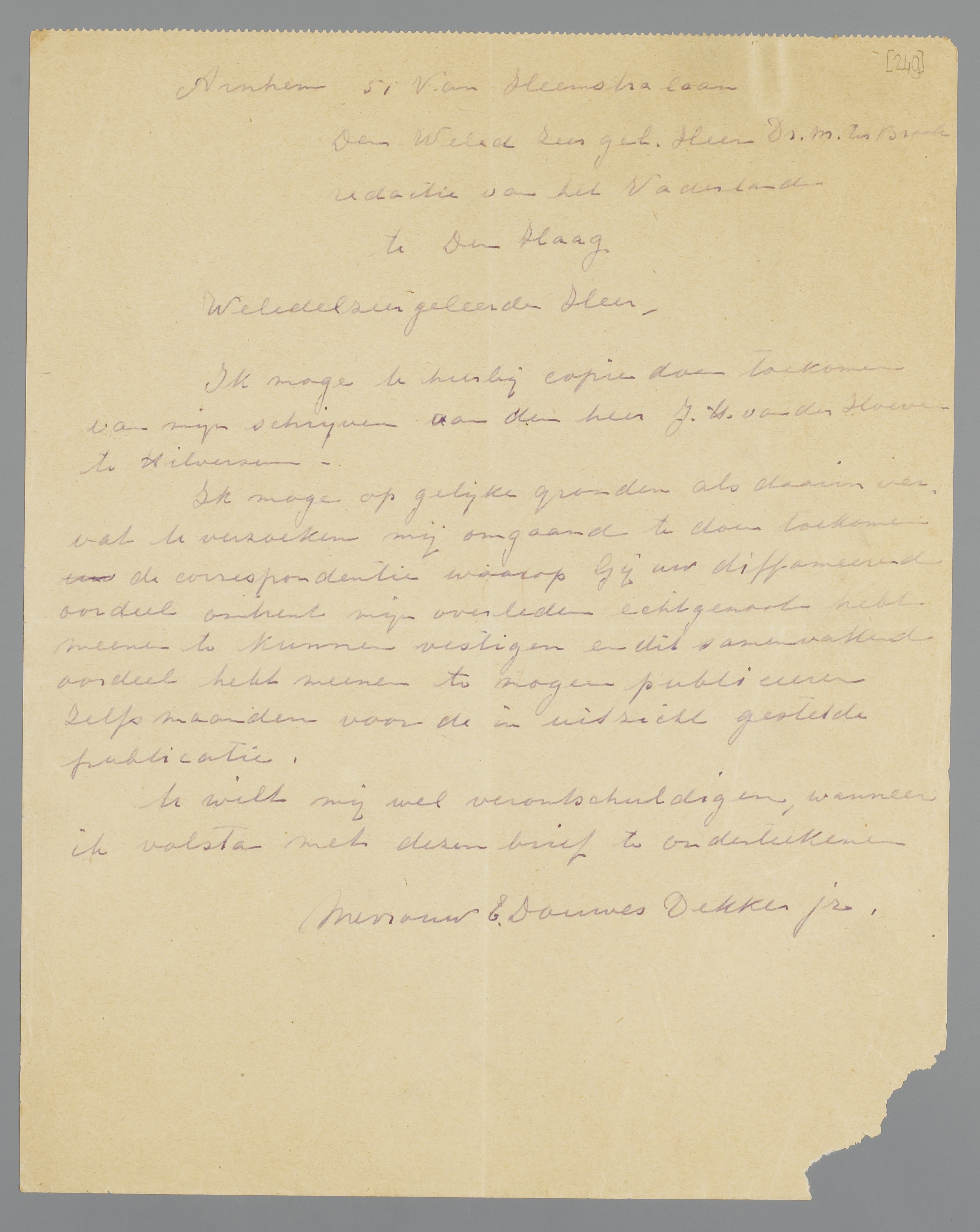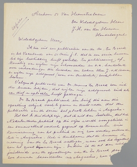 Ik zie uit een publicatie van dr. M. ter Braak in het Vaderland van 31 Mei j.l. dat U een serie brieven tot zijn beschikking heeft gesteld ter publiceering, afkomstig van wijlen mijn schoonvader en o.a. handelend over verhoudingen die tusschen een zekere Heer J. v.d. Hoeven en wijlen mijn echtgenoot (zoon van Multatuli) zouden hebben bestaan.