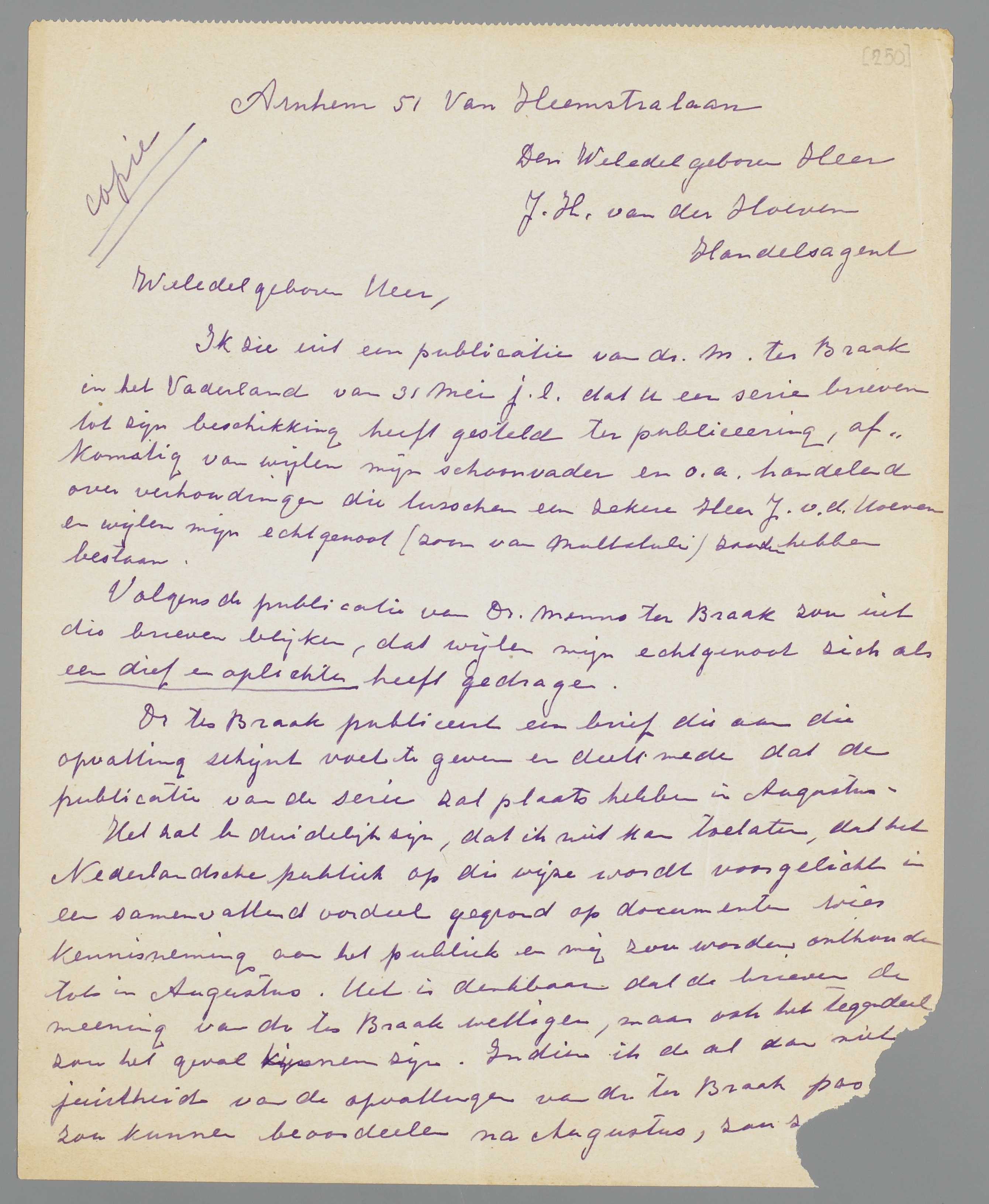 Daar U blijkbaar afschrift aan dr. ter Braak heeft verschaft, meen ik U te mogen vragen mij omgaand eveneens een stel afschriften te doen toekomen.