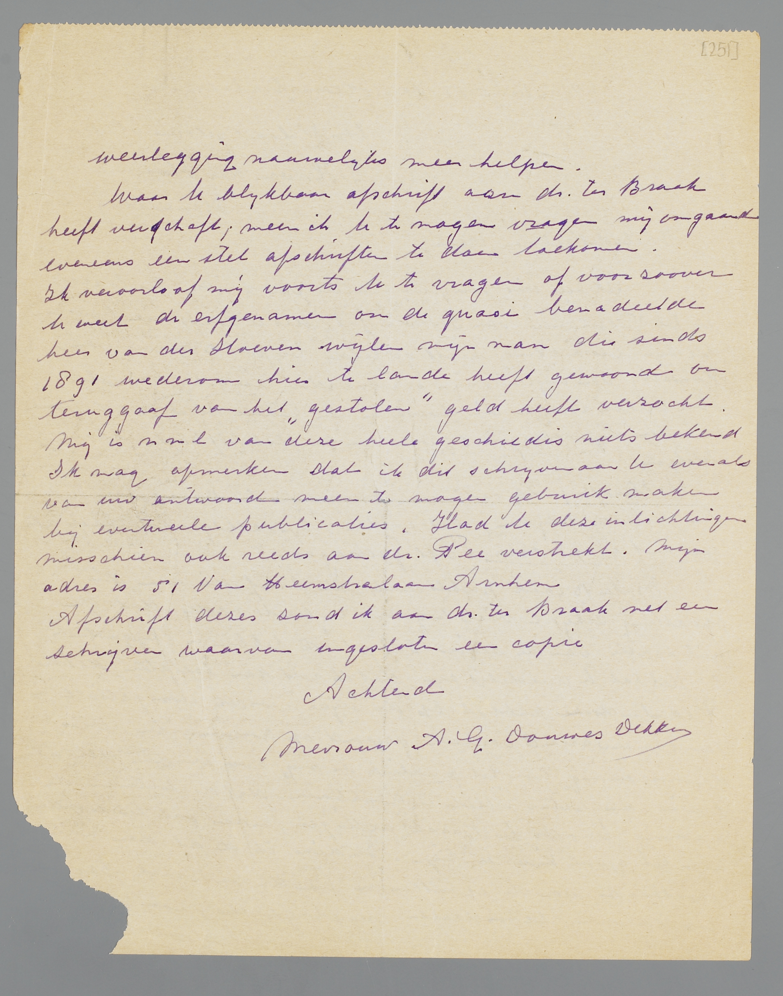 Ik veroorloof mij voorts U te vragen of voor zoover U weet de erfgenamen van de quasi benadeelde heer van der Hoeven wijlen mijn man die sinds 1891 wederom hier te lande heeft gewoond om teruggaaf van het ‘gestolen’ geld heeft verzocht.