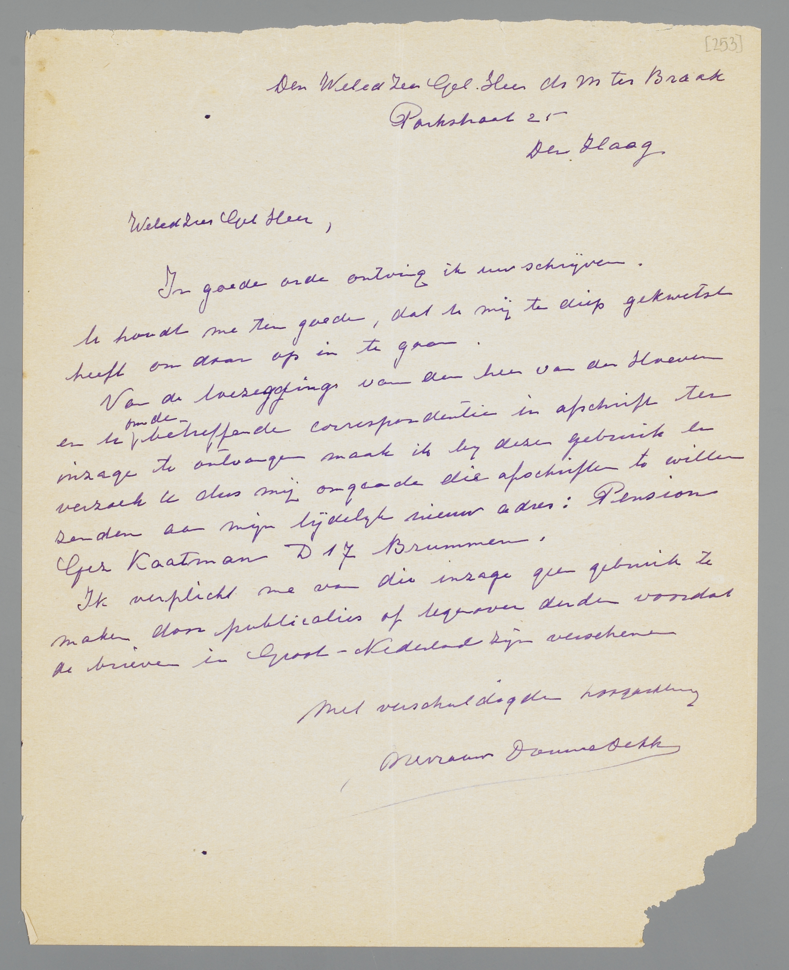 Van de toezegging van den heer van der Hoeven en U om den betreffende correspondentie in afschrift ter inzage te ontvangen maak ik bij dezen gebruik en verzoek U dus mij omgaande die afschriften te willen zenden aan mijn tijdelijk nieuw adres: Pension Gez Kaatman D 17 Brummen.