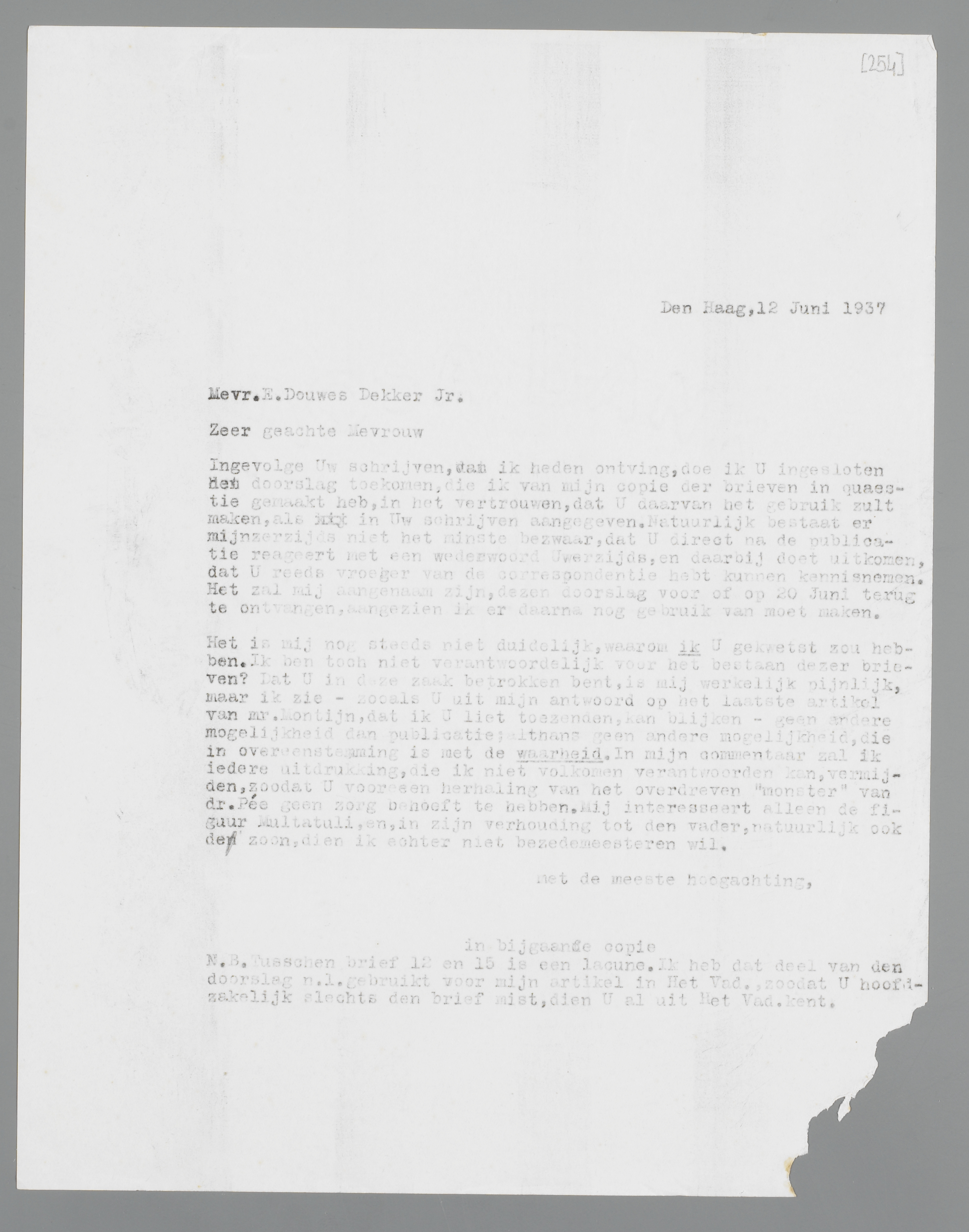 Ingevolge Uw schrijven, dat ik heden ontving, doe ik U ingesloten met doorslag toekomen, die ik van mijn copie der brieven in quaestie gemaakt hebt, in het vertrouwen, dat U daarvan het gebruik zult maken, als in Uw schrijven aangegeven. Natuurlijk bestaat er mijnerzijds niet het minste bezwaar, dat U direct na de publicatie reageert met een wederwoord Uwerzijds: en daarbij doet uitkomen dat U reeds vroeger van de correspondentie hebt kunnen kennisnemen. Het zal mij aangenaam zijn, deze doorslag voor of op 20 juni terug te ontvangen, aangezien ik er daarna nog gebruik van moet maken.