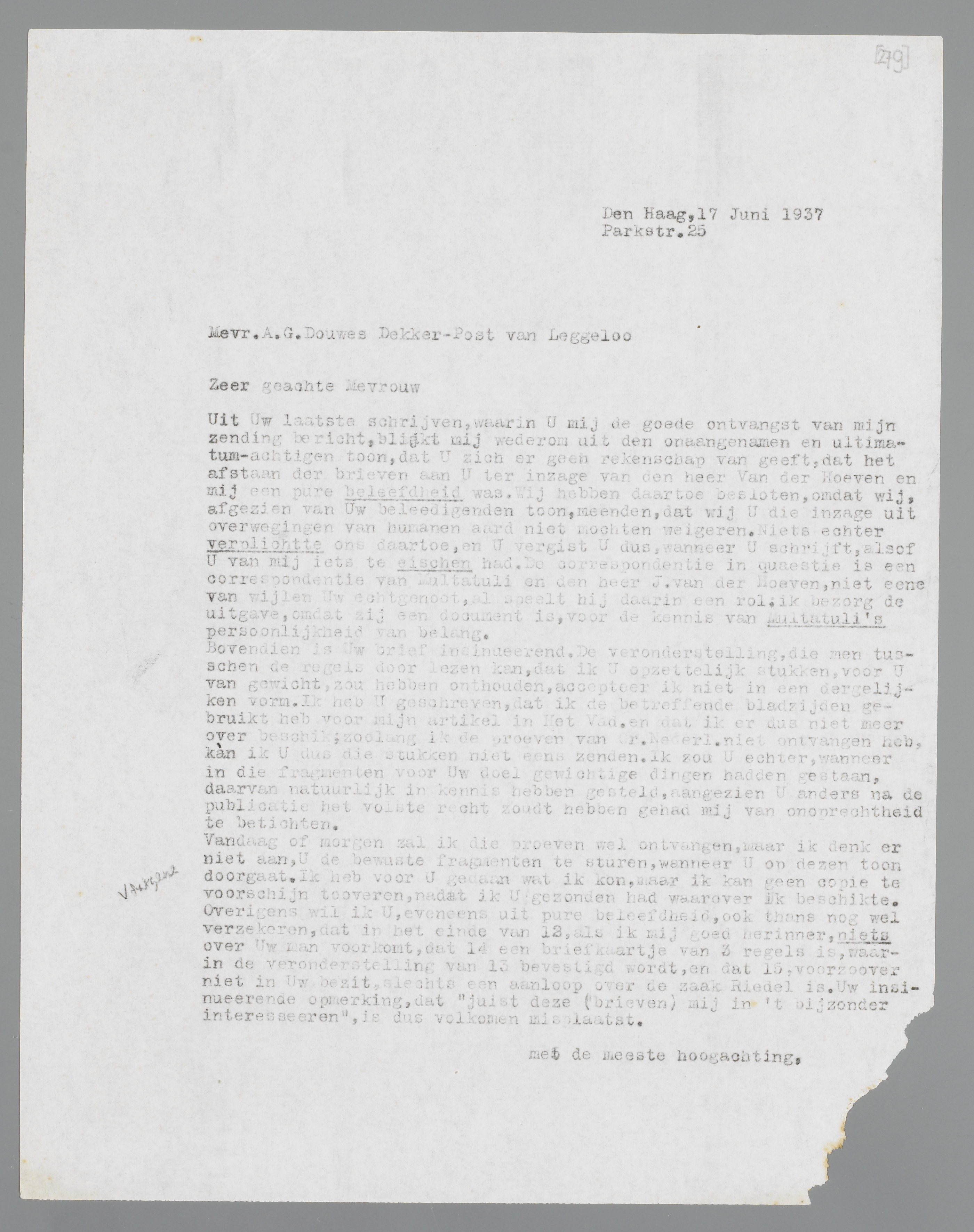 Uit Uw laatste schrijven, waarin U mij de goede ontvangst van mijn zending bericht, blijkt mij wederom uit den onaangenamen en ultimatum-achtigen toon, dat U zich er geen rekenschap van geeft, dat het afstaan van brieven aan U ter inzage van den heer Van der Hoeven en mij een pure beleefdheid was. Wij hebben daartoe besloten, omdat wij, afgezien van Uw beleedigenden toon, meenden, dat wij U die inzage uit overwegingen van humanen aard niet mochten weigeren. Niets echter verplichtte ons daartoe, en U vergist U dus, wanneer U schrijft, alsof U van mij nog iets te eischen had. De correspondentie in quaestie is een correspondentie van Multatuli en den heer J. van der Hoeven, niet eens van wijlen Uw echtgenoot, al speelt hij daarin een rol; ik bezorg de uitgave, omdat zij een document is, voor de kennis van Multatuli's persoonlijkheid van belang.