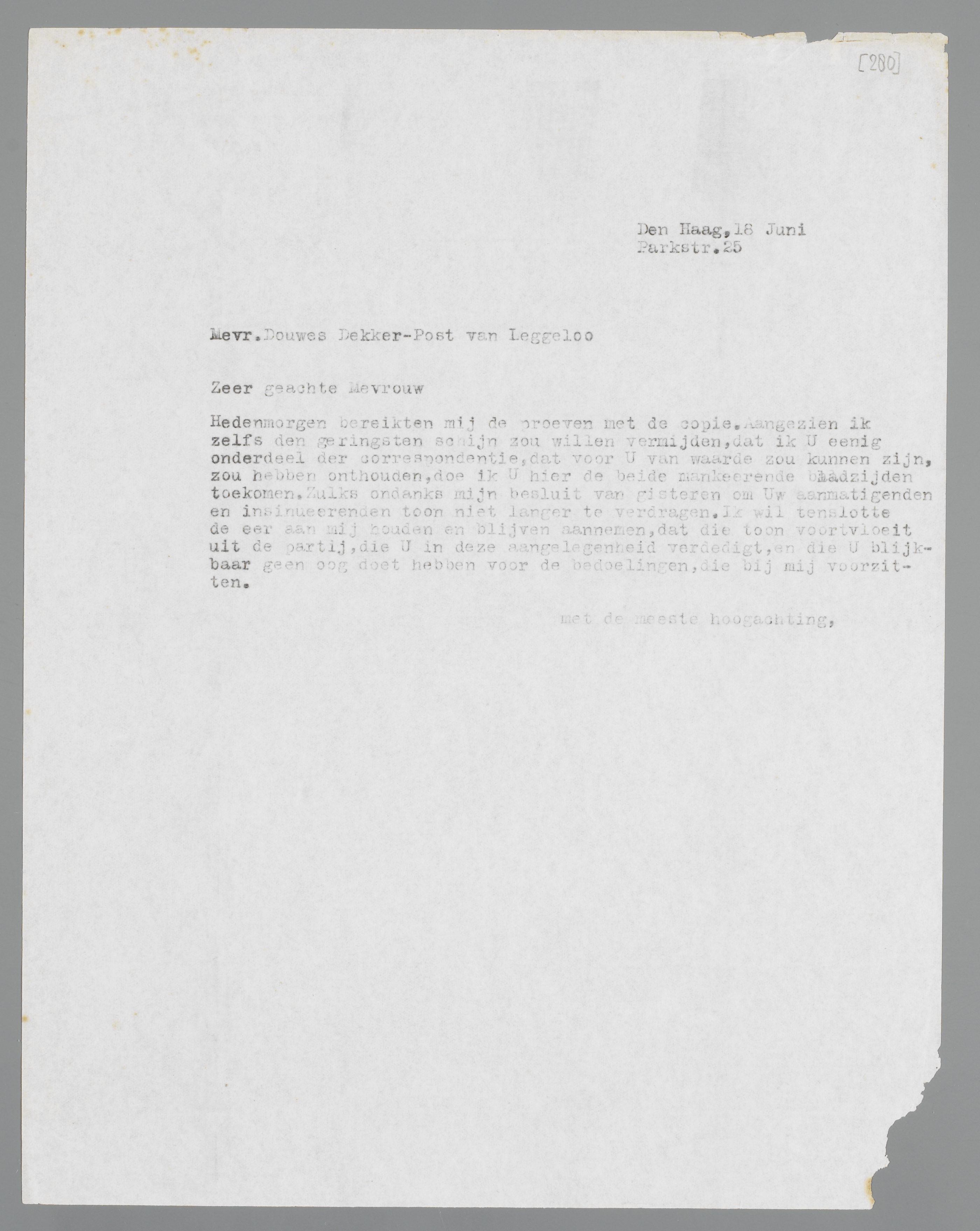 Hedenmorgen bereikten mij de proeven met de copie. Aangezien ik zelfs den geringsten schijn zou willen vermijden, dat ik U eenig onderdeel der correspondentie, dat voor U van waarde zou kunnen zijn, zou hebben onthouden, doe ik U hier de beide mankeerende bladzijden toekomen. Zulks ondanks mijn besluit van gisteren om Uw aanmatigenden en insinueerenden toon niet langer te verdragen. Ik wil tenslotte de eer aan mij houden en blijven aannemen, dat die toon voortvloeit uit de partij, die U in deze aangelegenheid verdedigt, en die U blijkbaar geen oog doet hebben voor de bedoelingen, die bij mij voorzitten.