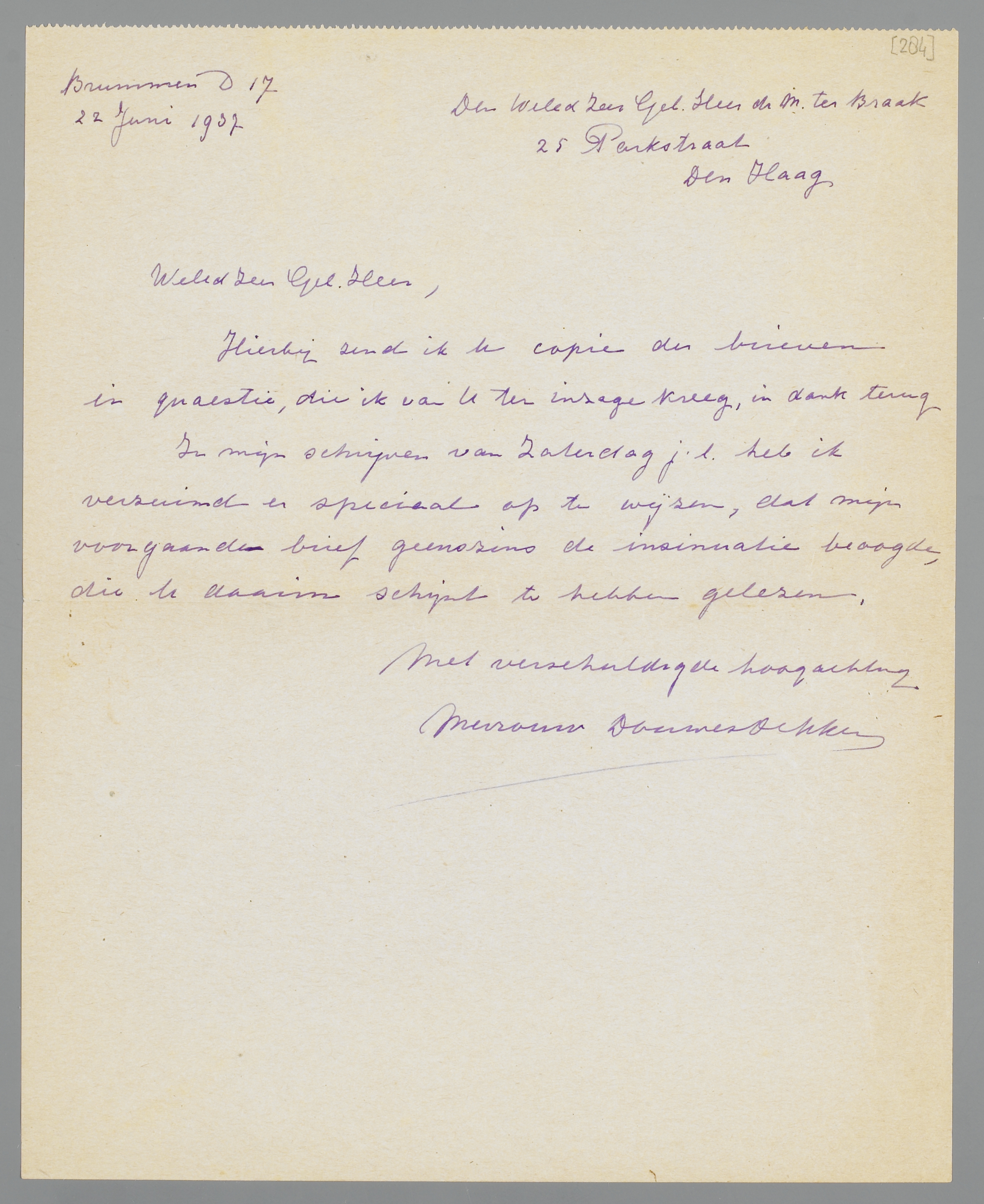 Hierbij zend ik U copie der brieven in quaestie, die ik van U ter inzage kreeg, in dank terug.