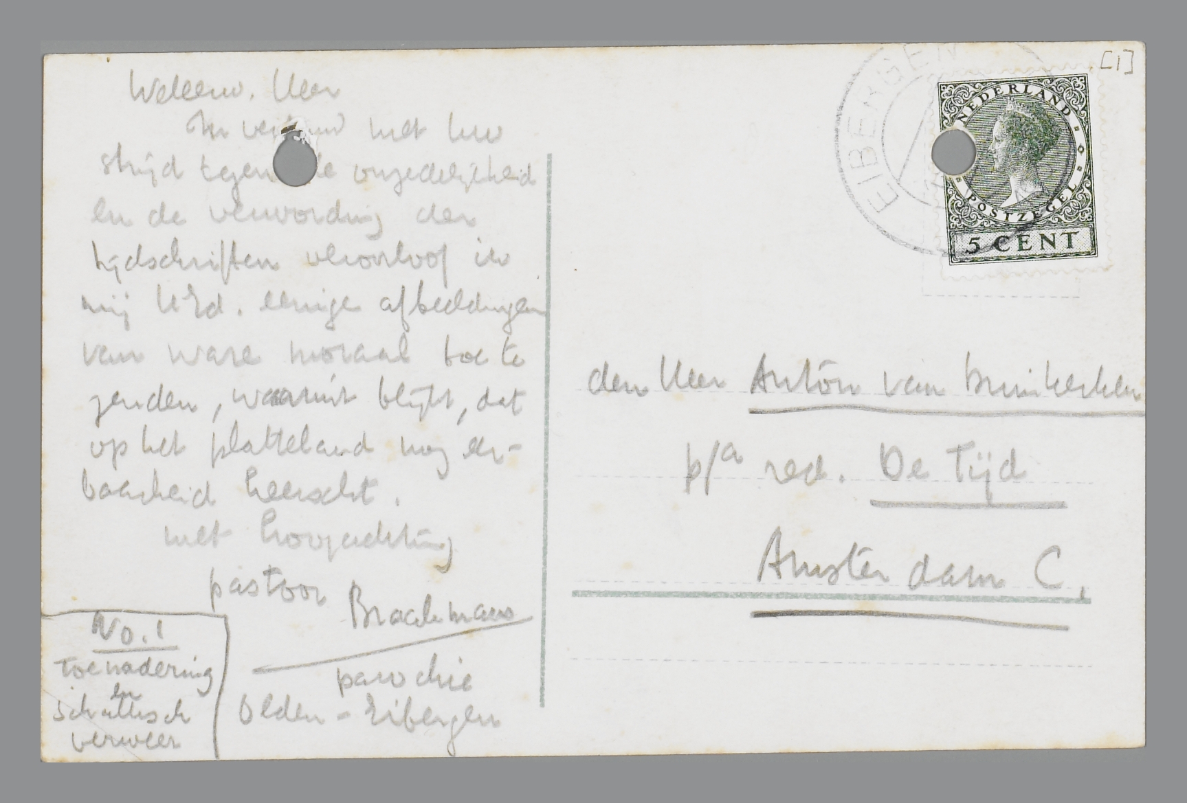 In verband met Uw strijd tegen de onzedelijkheid en de verwording der tijdschriften veroorloof ik mij UEd eenige afbeeldingen van ware moraal toe te zenden, waaruit blijkt, dat op het platteland nog eerbaarheid heerscht.