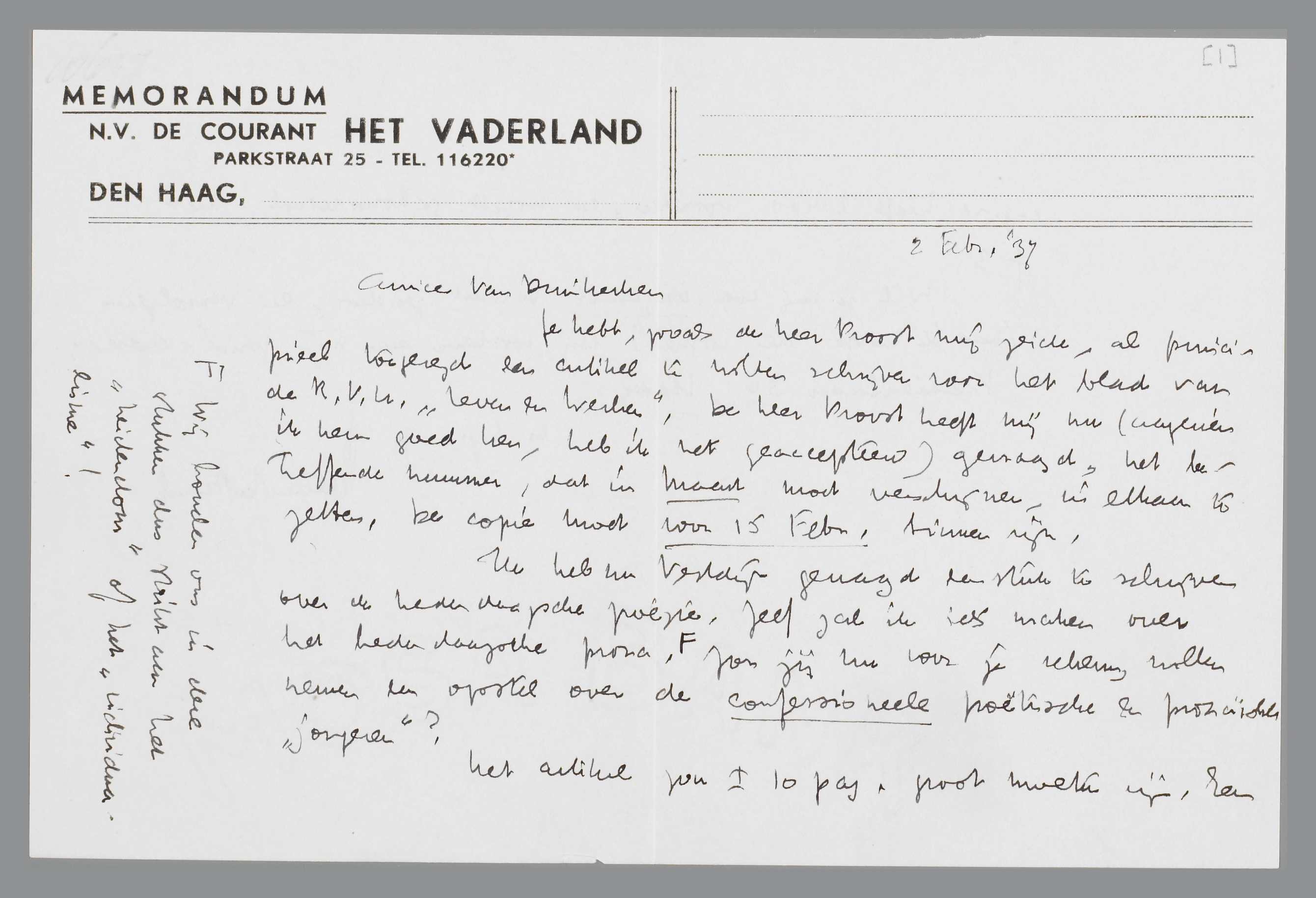 Je hebt, zooals de heer Proost mij zeide, al principieel toegezegd een artikel te zullen schrijven voor het blad van de R.V.U. ‘Leven en Werken’, de heer Proost heeft mij nu (aangezien ik hem goed ken, heb ik het geaccepteerd) gevraagd, het betreffende nummer, dat in Maart moet verschijnen, in elkaar te zetten, de copie moet voor 15 Febr. binnen zijn.