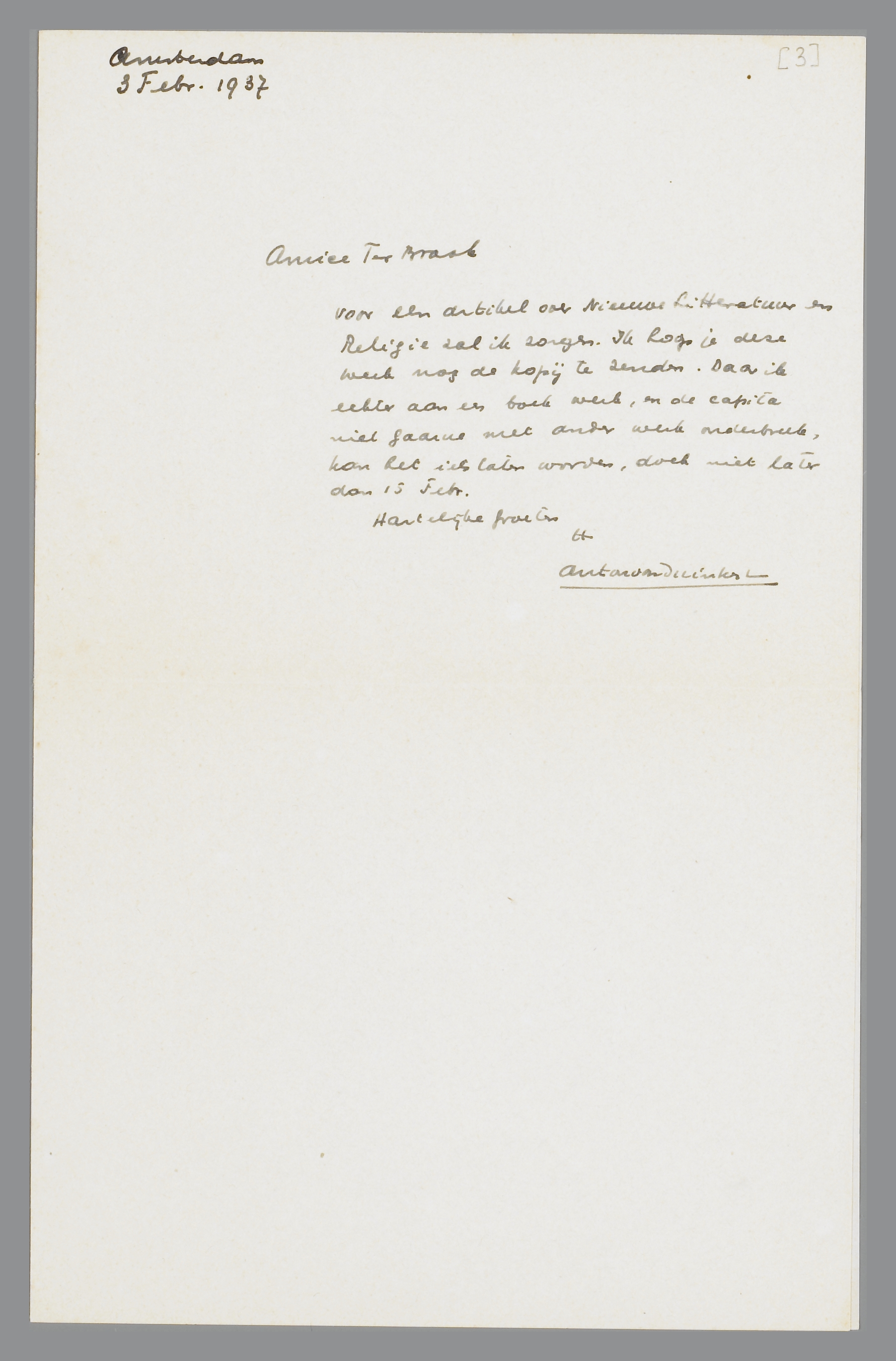 voor een artikel over Nieuwe Litteratuur en Religie zal ik zorgen. Ik hoop je deze week nog de kopij te zenden. Daar ik echter aan een boek werk, en de capita niet gaarne met ander werk onderbreek, kan het iets later worden, doch niet later dan 15 Febr.