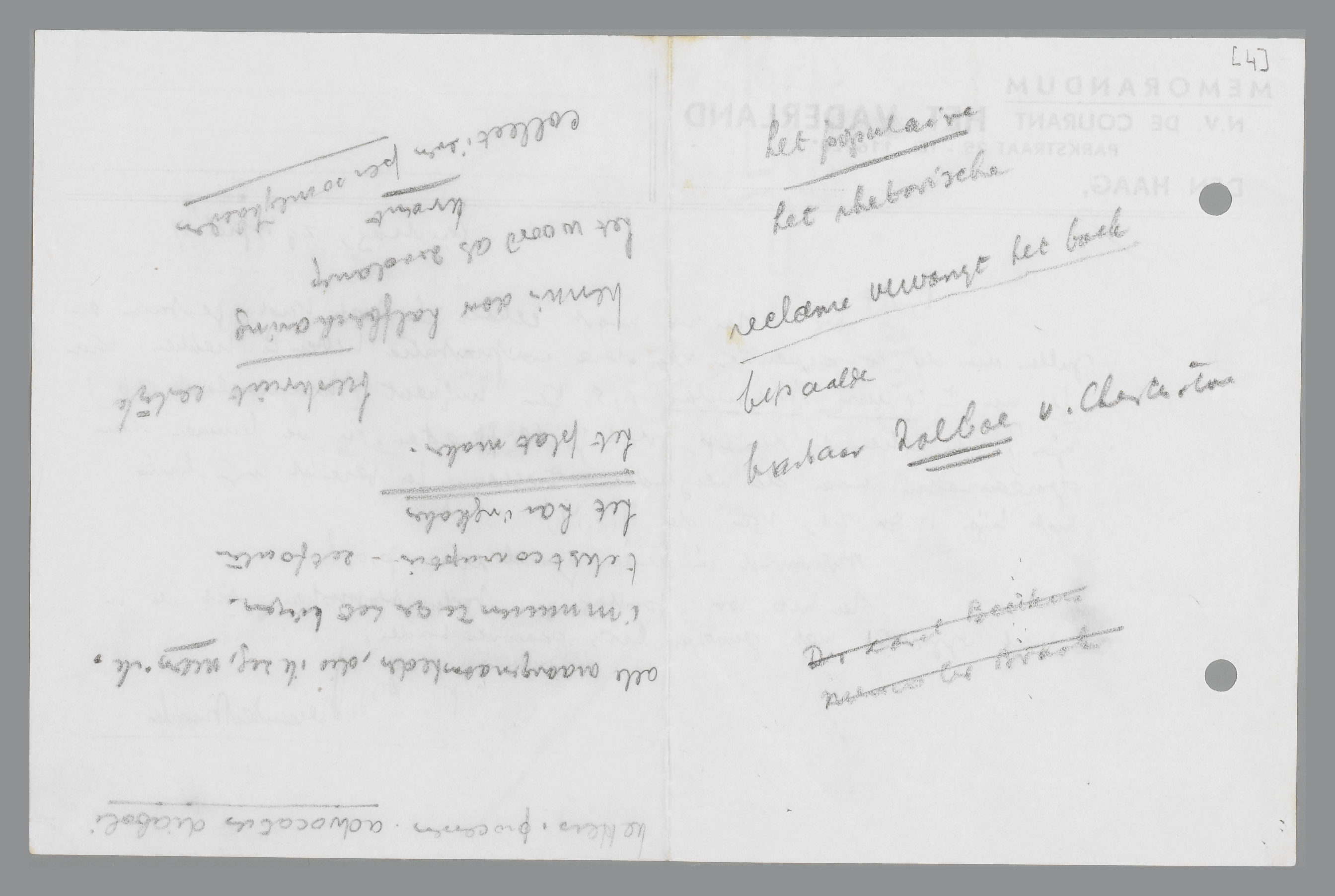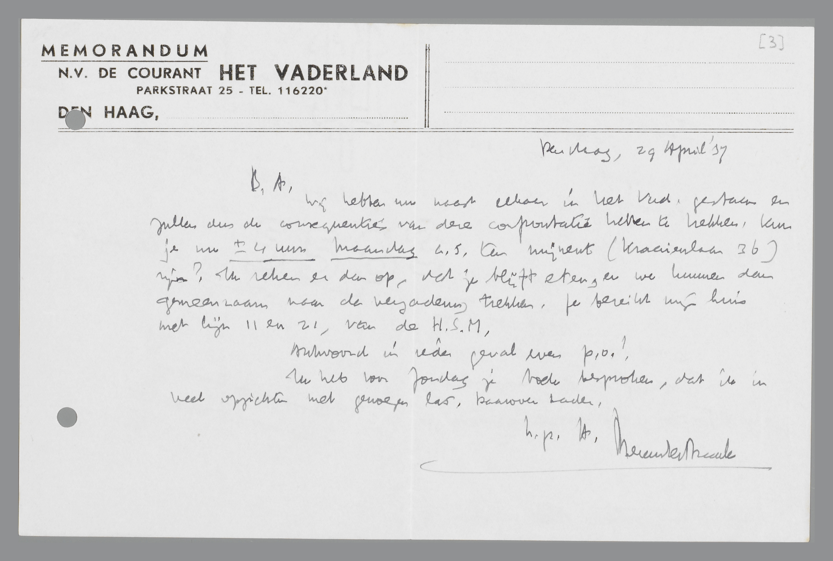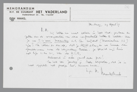Wij hebben nu naast elkaar in het Vad. gestaan en zullen dus de consequenties van deze confrontatie hebben te trekken. Kun je nu ± 4 uur Maandag a.s. ten mijnent (Kraaienlaan 36) zijn? Ik reken er dan op, dat je blijft eten, en we kunnen dan gemeenzaam naar de vergadering trekken. Je bereikt mijn huis met lijn 11 en 21, van de H.S.M.