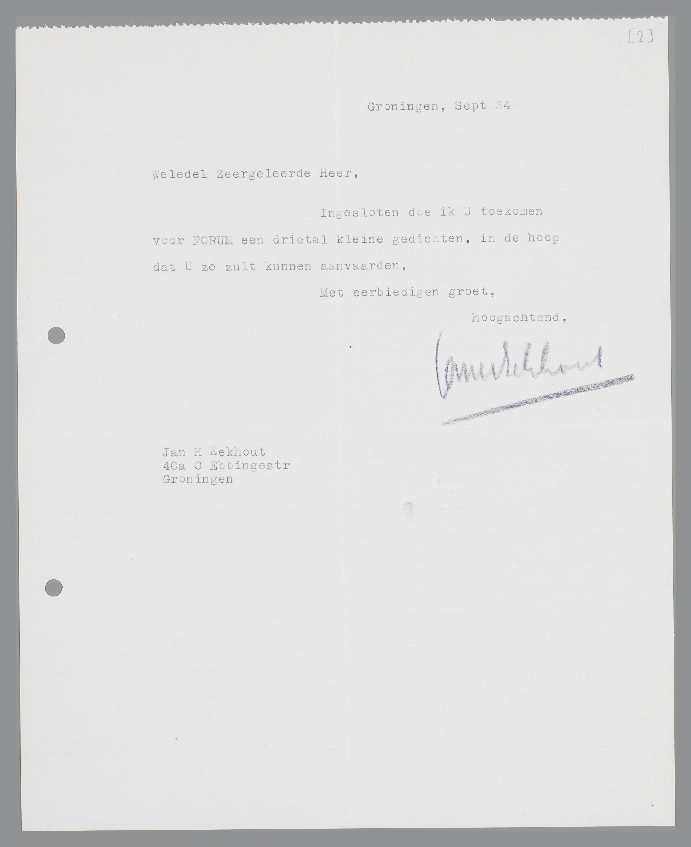 Ingesloten doe ik U toekomen voor FORUM een drietal kleine gedichten, in de hoop dat U ze zult aanvaarden.