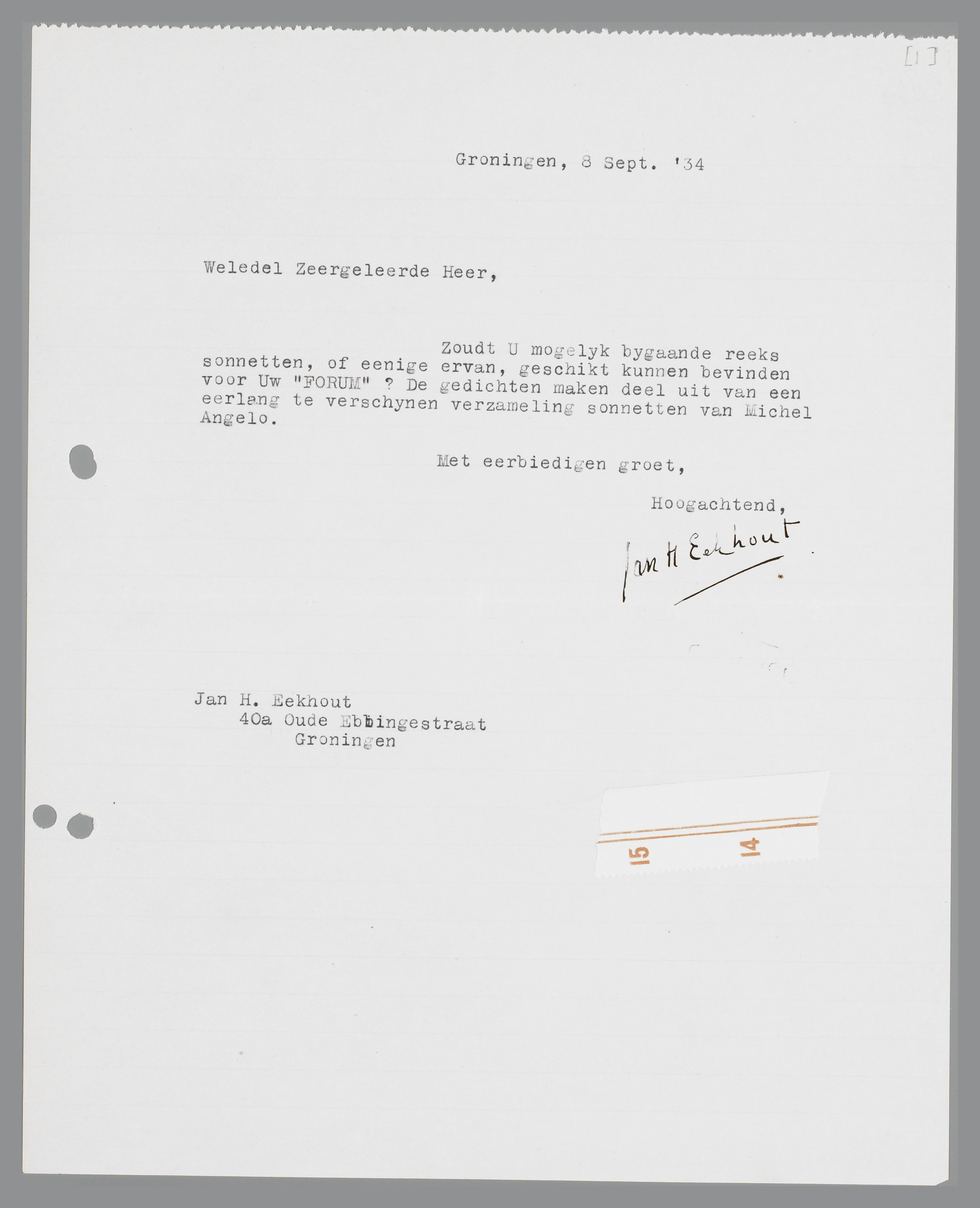 Zoudt U mogelyk bijgaande reeks sonnetten, of eenige ervan, geschikt kunnen bevinden voor Uw ‘FORUM’? De gedichten maken deel uit van een eerlang te verschynen verzameling sonnetten van Michel Angelo.