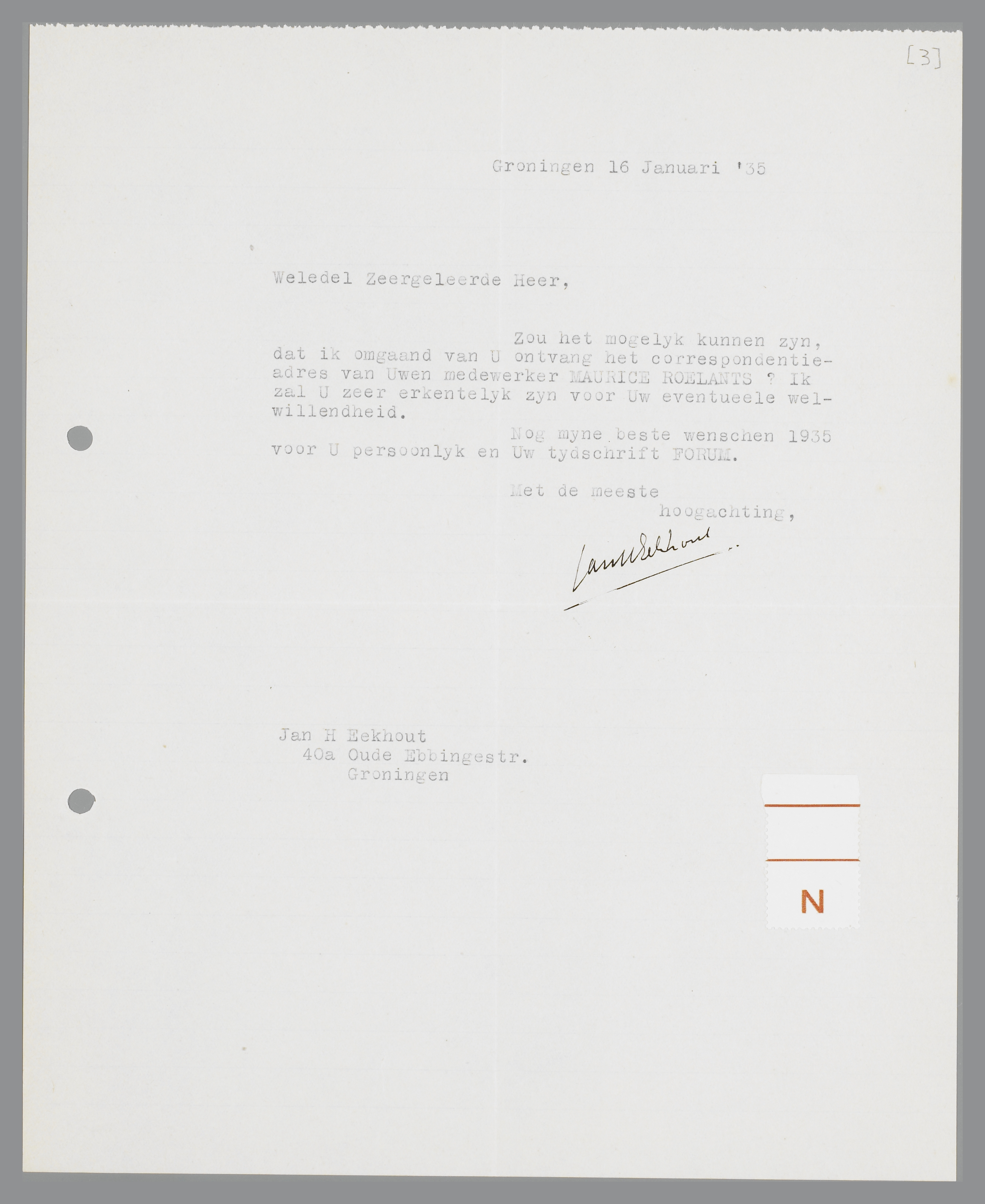 Zou het moglyk kunnen zyn, dat ik omgaand van U ontvang het correspondentie-adres van Uwen medewerker MAURICE ROELANTS? Ik zal U zeer erkentelyk zijn voor Uw eventueele welwillendheid.