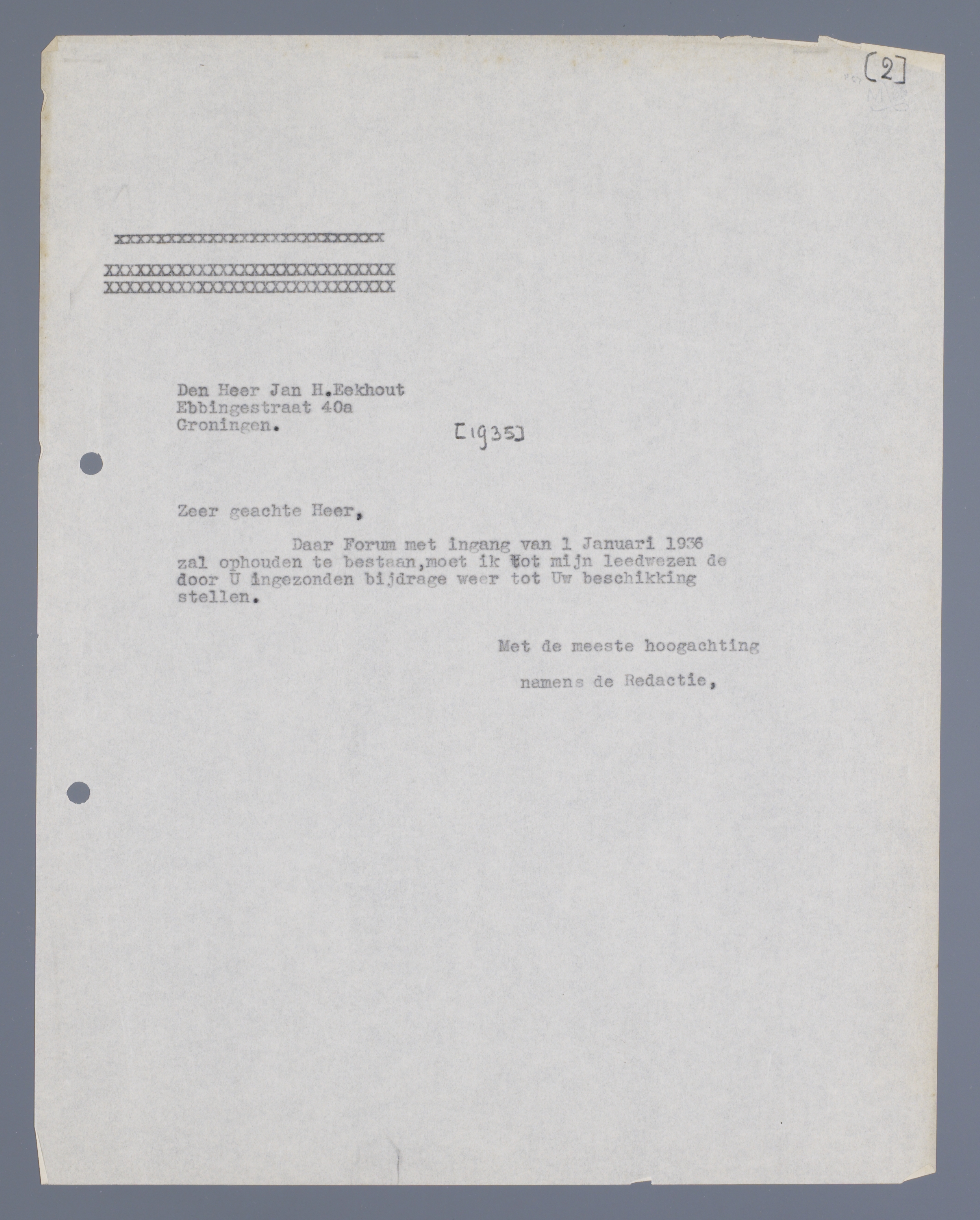 Daar Forum met ingang van 1 januari 1936 zal ophouden te bestaan, moet ik tot mijn leedwezen de door U ingezonden bijdragen weer tot uw beschikking stellen.