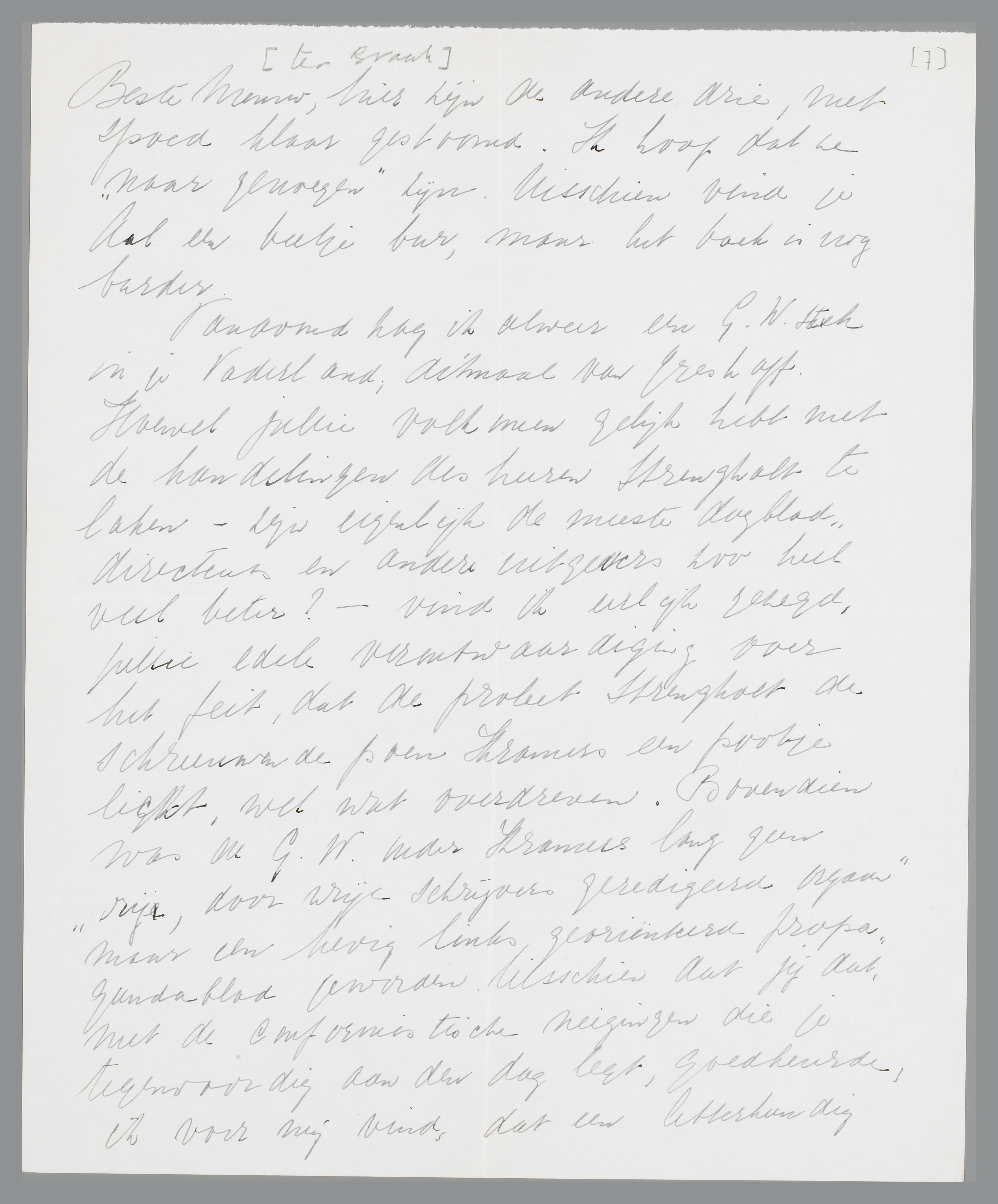 Vanavond zag ik alweer een G.W. stuk in je Vaderland, ditmaal van Greshoff. Hoewel jullie volkomen gelijk hebt met de handelingen des heeren Strengholt te laken - zijn eigenlijk de meeste dagbladdirecteurs en andere uitgevers zoo heel veel beter? - vind ik eerlijk gezegd, jullie edele verontwaardiging over het feit, dat de proleet Strengholt de schreeuwende poen Kramers een pootje licht, wel wat overdreven. Bovendien was de G.W. onder Kramers lang geen ‘vrij, door vrije schrijvers geredigeerd orgaan’ maar een hevig links georiënteerd propagandablad geworden. Misschien dat jij dat, met de conformistischen neigingen die je tegenwoordig aan den dag legt, goedkeurde, ik voor mij vind, dat een letterkundig tijdschrift, dat niet door een bepaalde partij de wereld wordt ingezonden, volkomen vrij van alle politieke tendensen moet zijn.