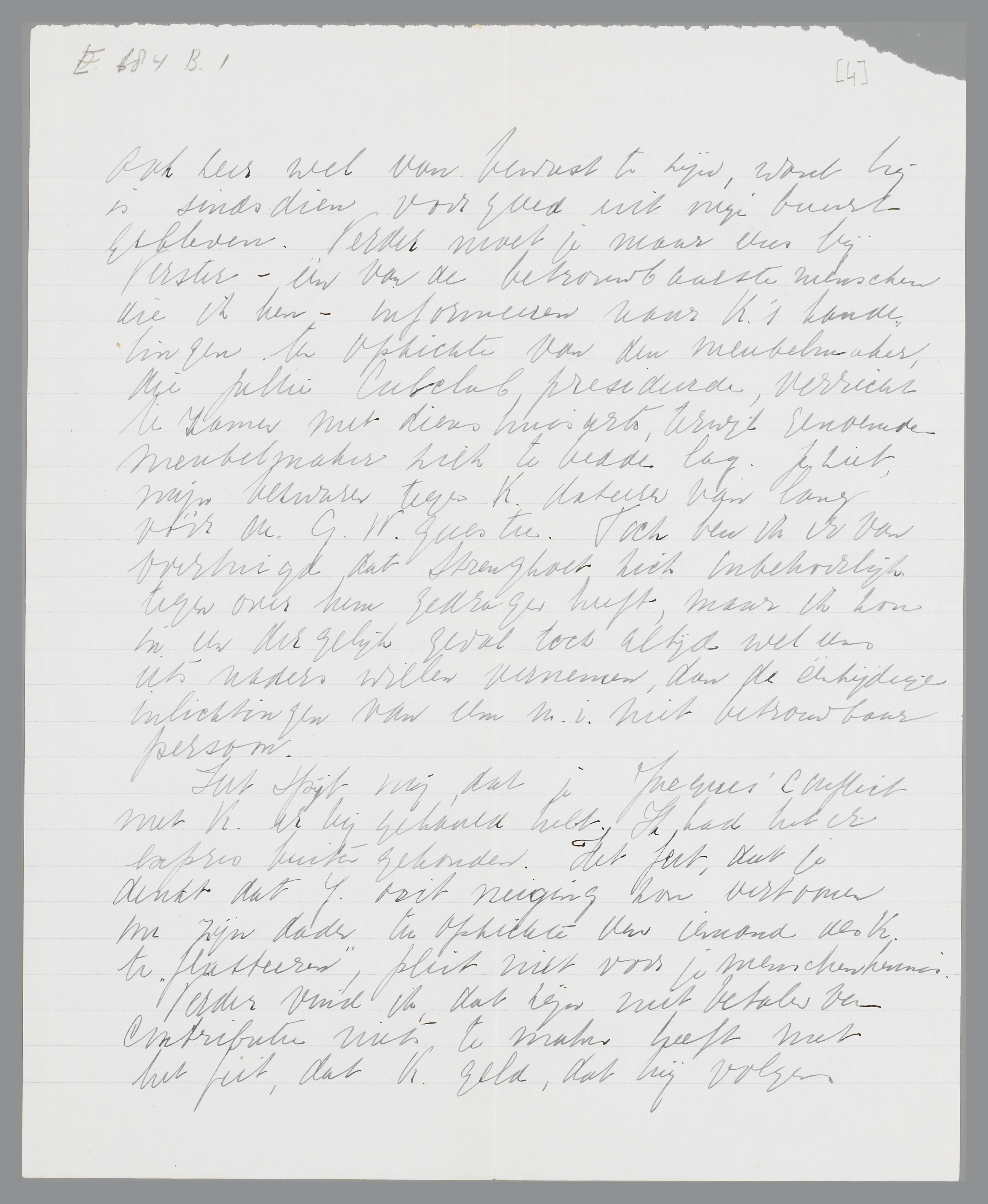 [Dit] kan je geen insinueeren meer van me noemen. Verder heb ik in dien tijd nog een staaltje van 's mans ware mentaliteit meegemaakt, dat te lang is om hier te beschrijven. K. schijnt zich daar ook heus wel van bewust te zijn, want hij is sindsdien voorgoed uit mijn buurt gebleven. Verder moet je maar eens bij Verster - één van de betrouwbaarste menschen die ik ken - informeeren naar K.'s handelingen ten opzichte van den meubelmaker, die jullie Cubclub presideerde, verricht te zamen met diens huisarts, terwijl genoemde meubelmaker ziek te bedde lag. Je ziet, mijn bezwaren tegen K. dateeren van lang vóór de G.W. questie. Toch ben ik ervan overtuigd dat Strengholt zich onbehoorlijk tegen over hem gedragen heeft, maar ik zou in een dergelijk geval toch altijd wel eens iets naders willen vernemen, dan de éénzijdige inlichtingen van een m.i. niet betrouwbaar persoon.