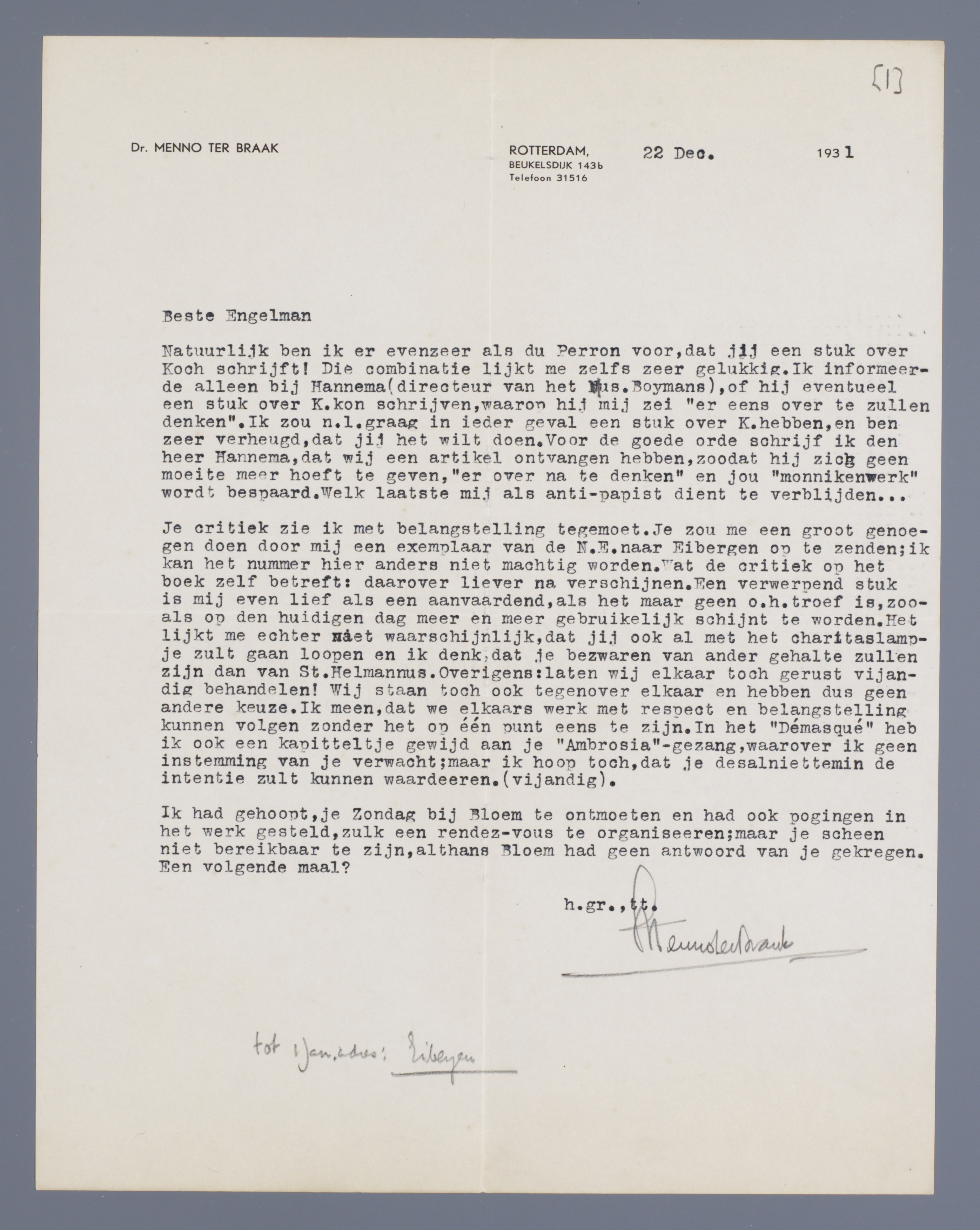 Natuurlijk ben ik er evenzeer als du Perron voor, dat jij een stuk over Koch schrijft! Die combinatie lijkt me zelfs zeer gelukkig. Ik informeerde alleen bij Hannema (directeur van het Mus. Boymans), of hij eventueel een stuk over K. Kon schrijven, waarop hij mij zei ‘er eens over te zullen denken’. Ik zou n.l. in ieder geval een stuk over K. hebben, en ben zeer verheugd, dat jij het wilt doen. Voor de goede orde schrijf ik den heer Hannema, dat wij een artikel ontvangen hebben, zoodat hij zich geen moeite meer hoeft te geven, ‘er over na te denken’ en jou ‘monnikenwerk’ wordt bespaard. Welk laatste mij als anti-papist dient te verblijden...