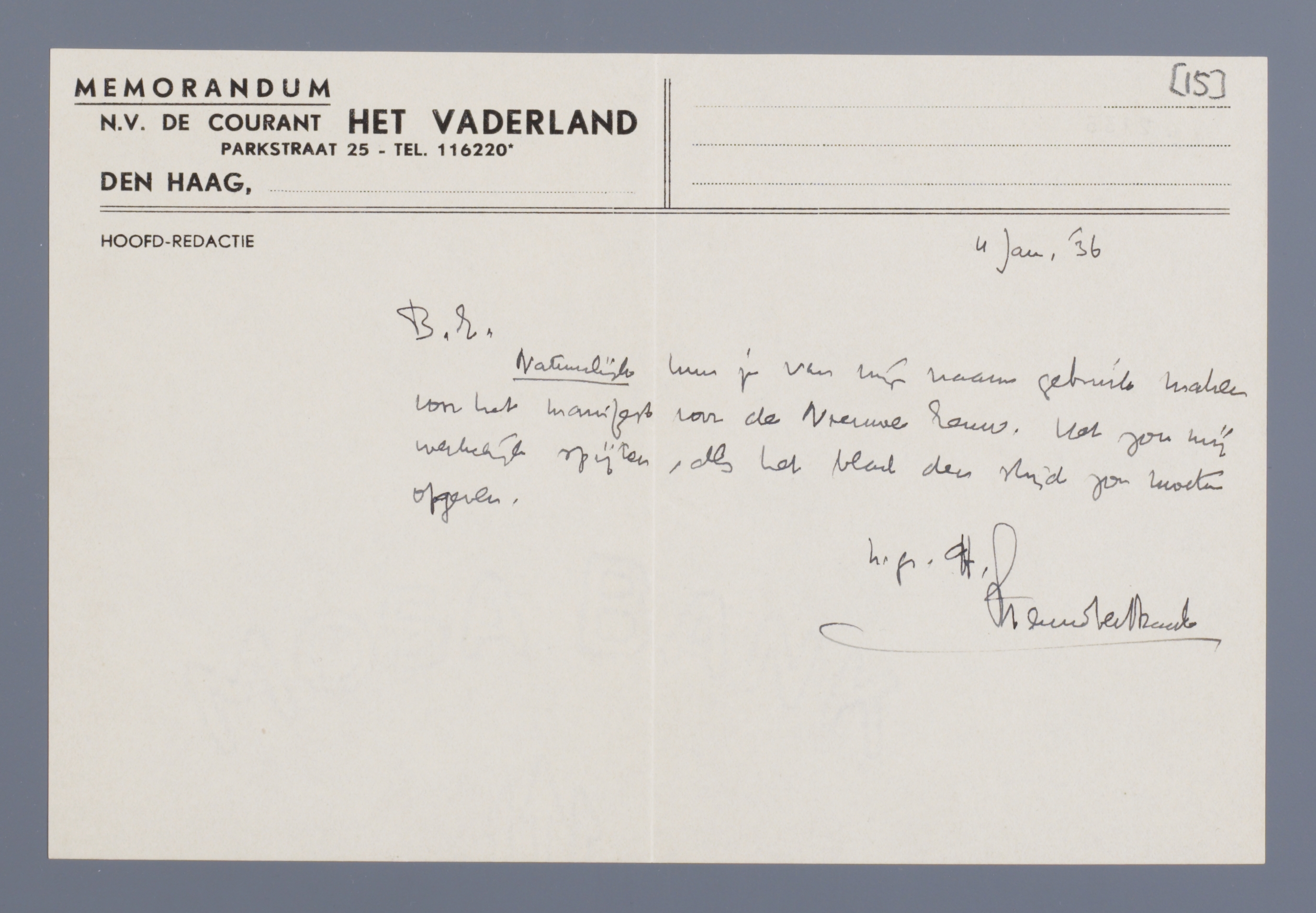 Natuurlijk kun je van mijn naam gebruik maken voor het manifest voor de Nieuwe Eeuw. Het zou mij werkelijk spijten, als het blad den strijd zou moeten opgeven.