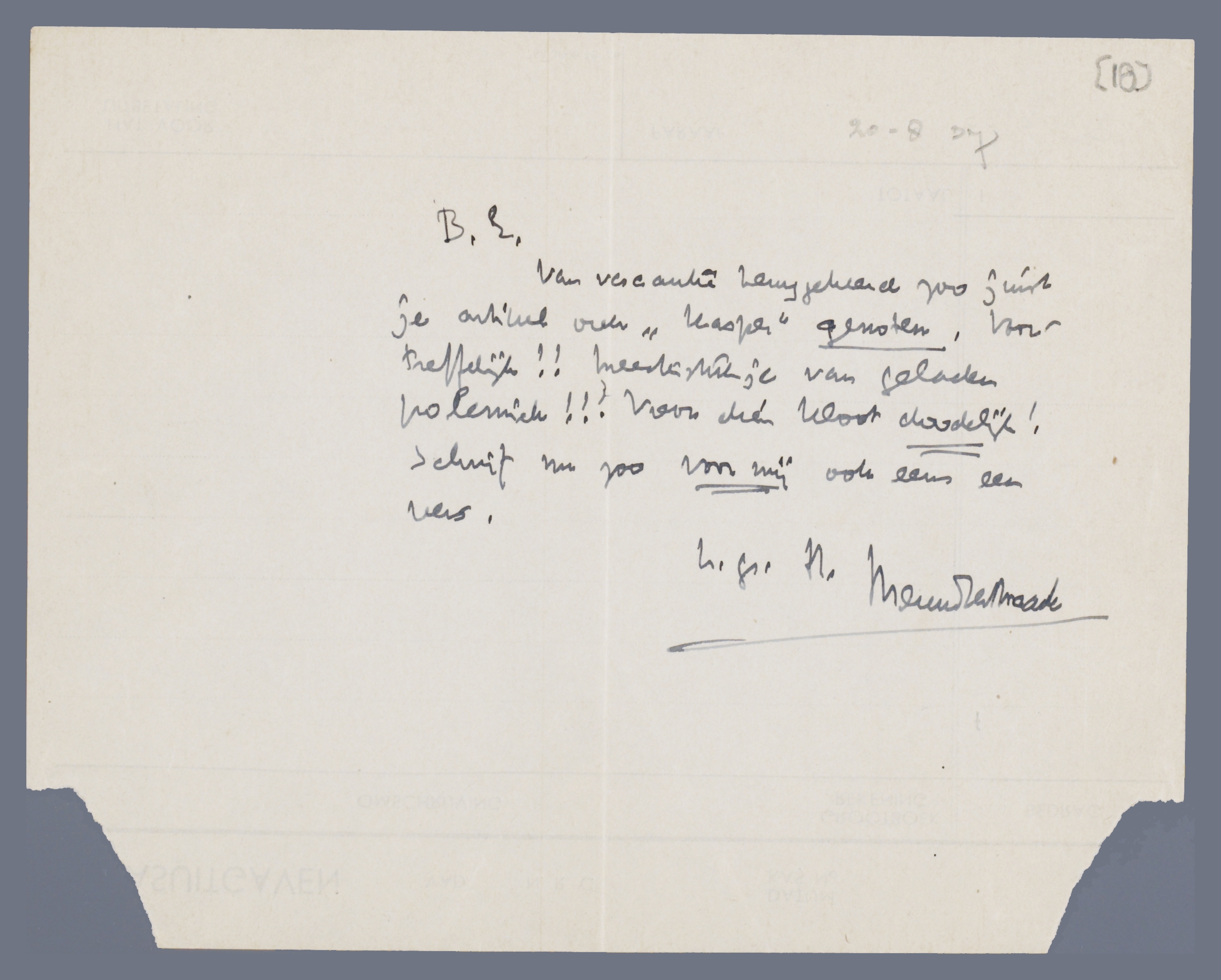 Van vacantie teruggekeerd zoo juist je artikel over ‘Kasper’ genoten. Voortreffelijk!! Meesterstukje van geladen polemiek!!! Voor dien kloot doodelijk! Schrijf nu zoo voor mij ook eens een vers!