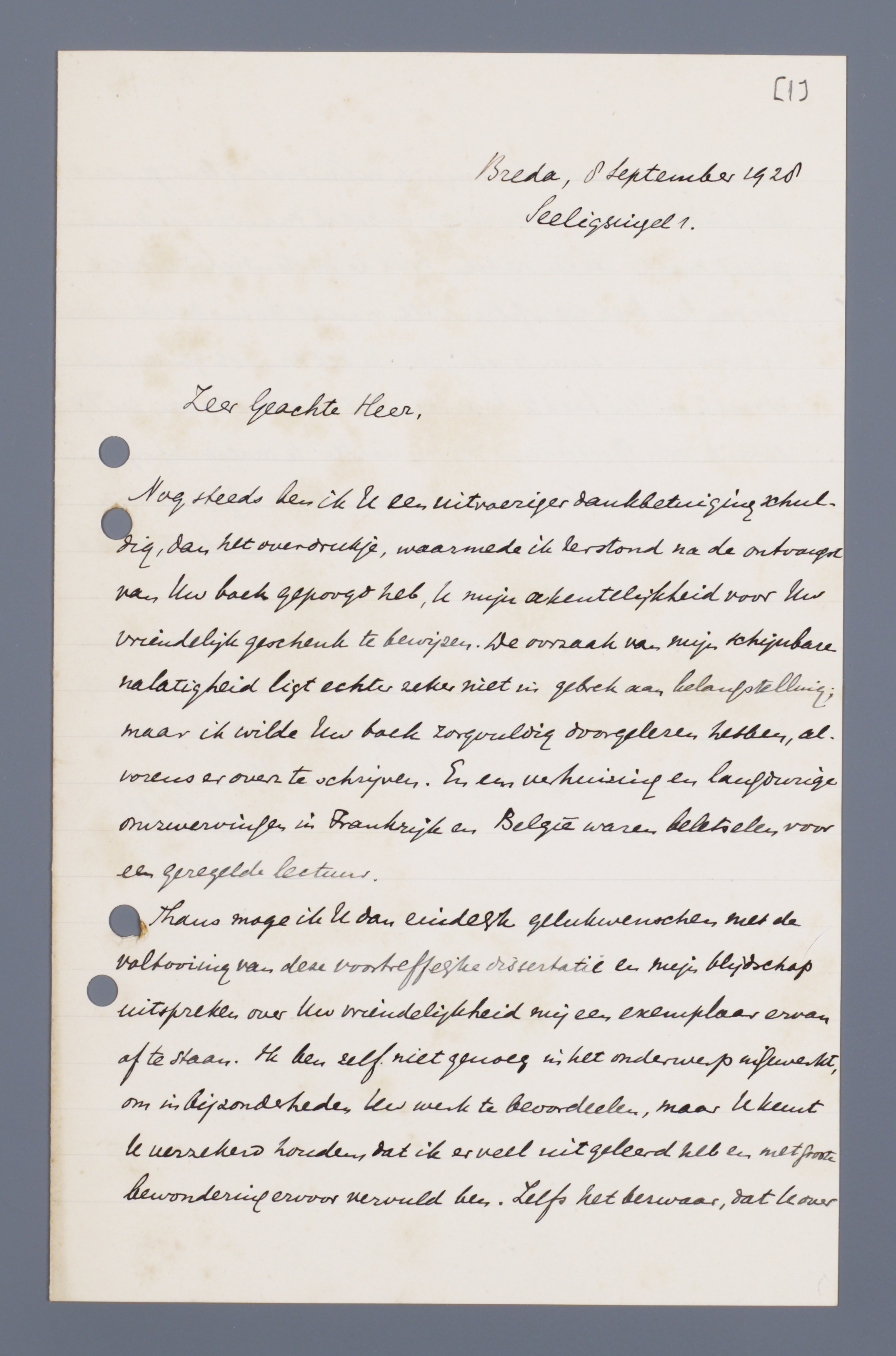 Nog steeds ben ik U een uitvoeriger dankbetuiging schuldig, dan het overdrukje, waarmede ik terstond na de ontvangst van Uw boek gepoogd heb, U mijn erkentelijkheid voor het vriendelijk geschenk te bewijzen. De oorzaak van mijn schijnbare nalatigheid ligt echter niet in gebrek aan belangstelling; maar ik wilde Uw boek zorgvuldig doorgelezen hebben, alvorens erover te schrijven. En een verhuizing en langdurige omzwervingen in Frankrijk en België waren beletselen voor een geregelde lectuur.