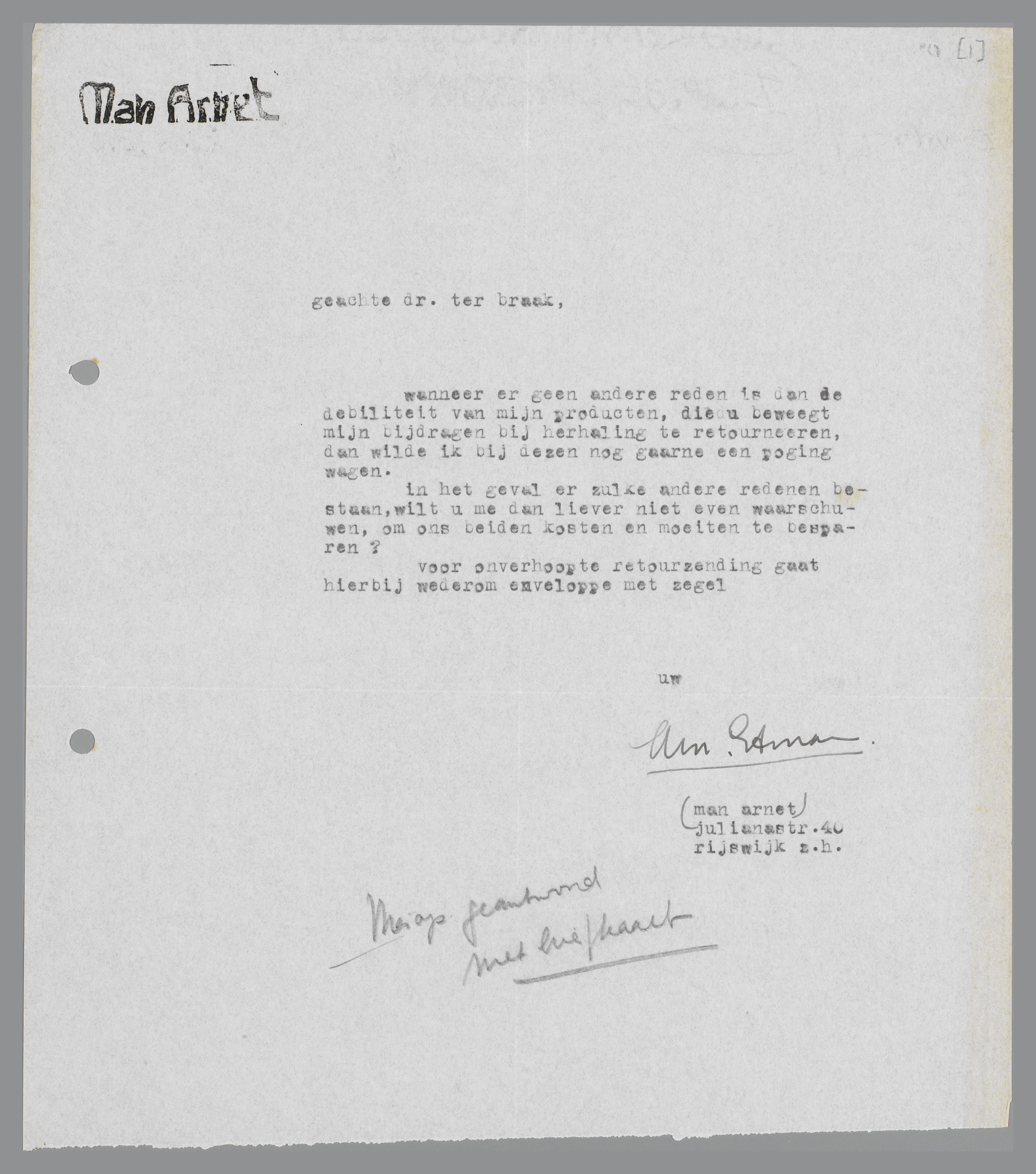 [toevoeging in handschrift Ter Braak:] Hierop geantwoord met briefkaart.