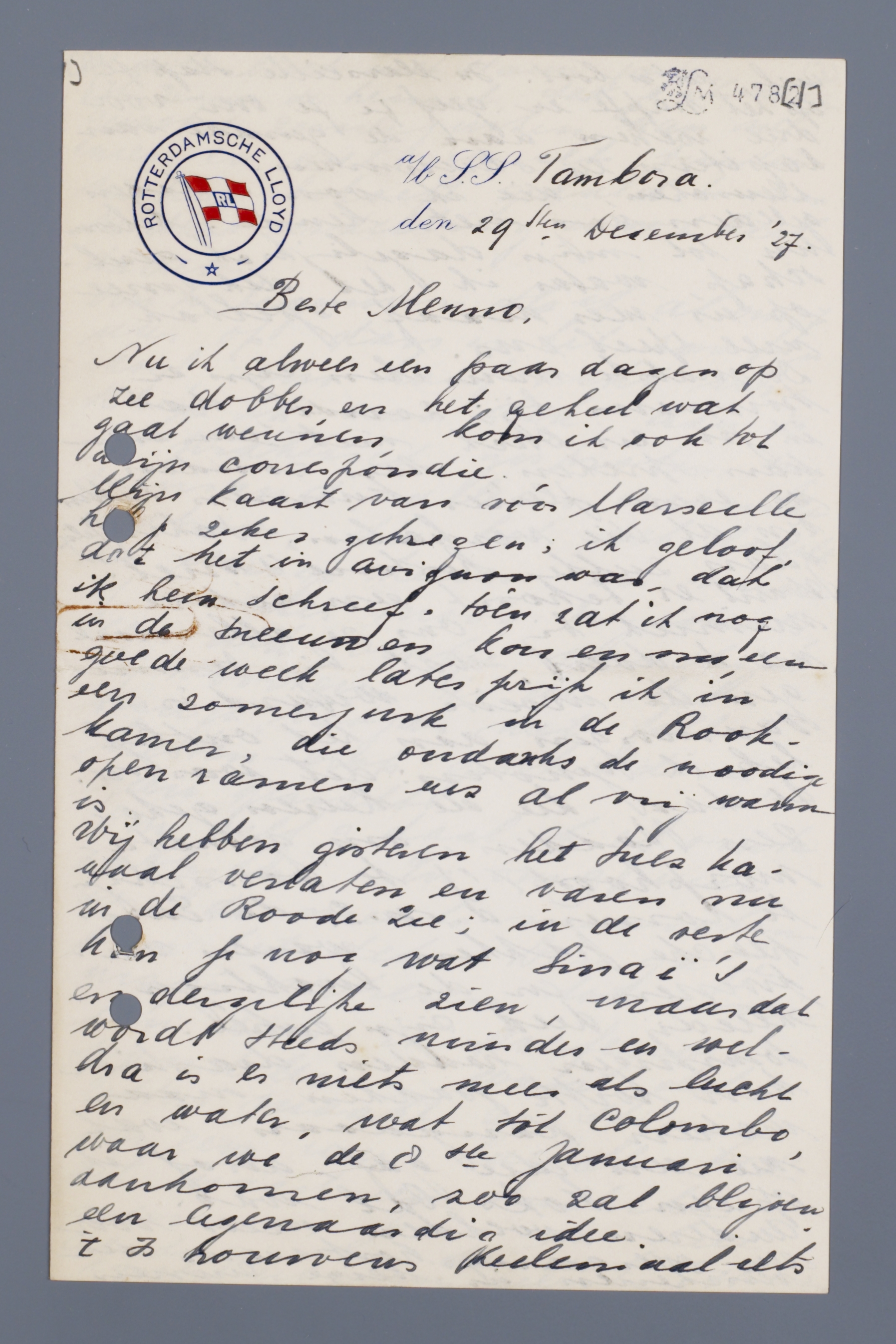 Wij hebben gisteren het Suez kanaal verlaten en varen nu in de roode Zee; in de verte kan je nog wat Sinaï's en dergelijke zien, maar dat wordt steeds minder en weldra is er niets meer als lucht en water, wat tot Colombo, waar we de 8ste Januari aankomen, zoo zal blijven; een eigenaardig idee.