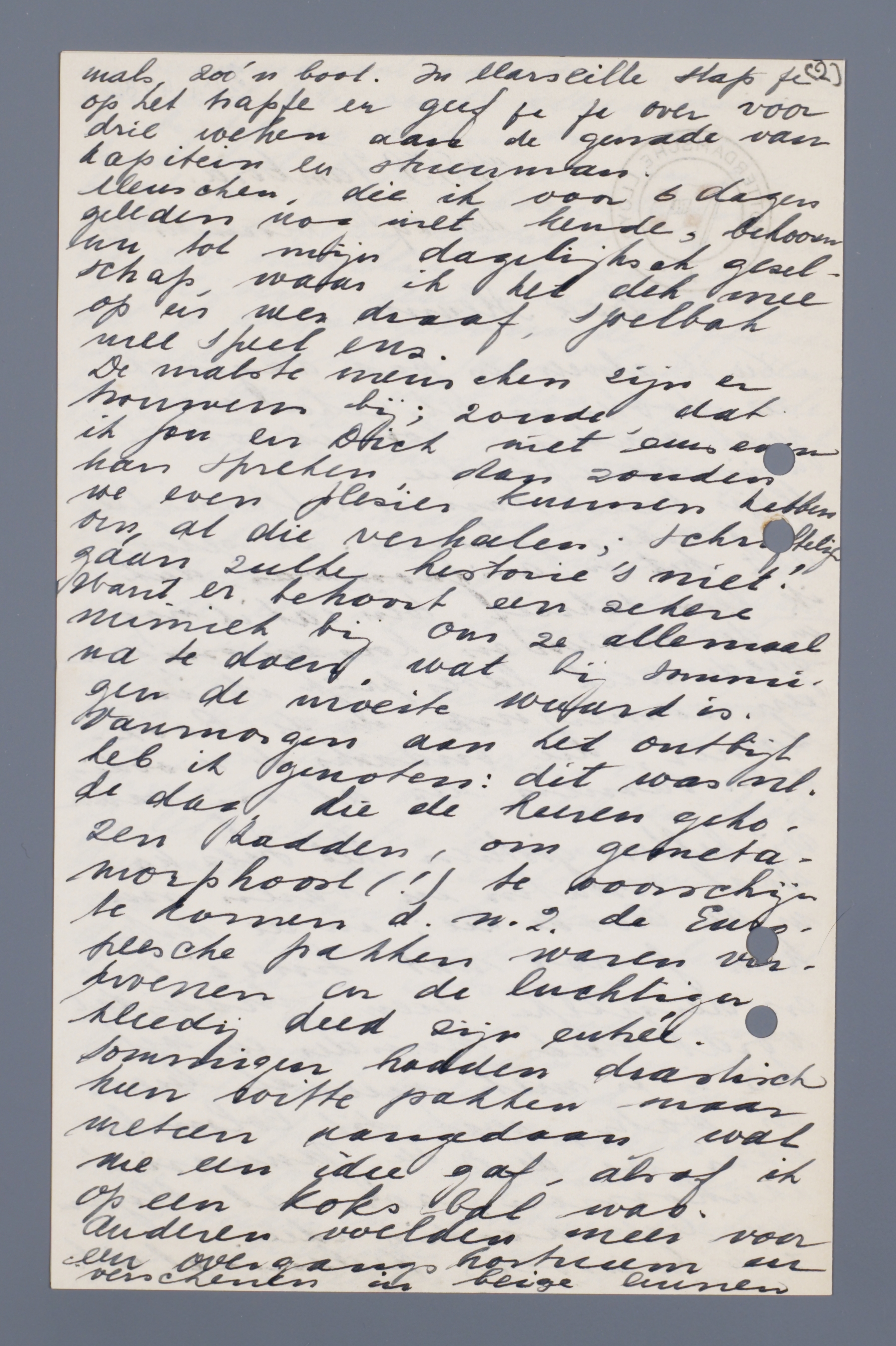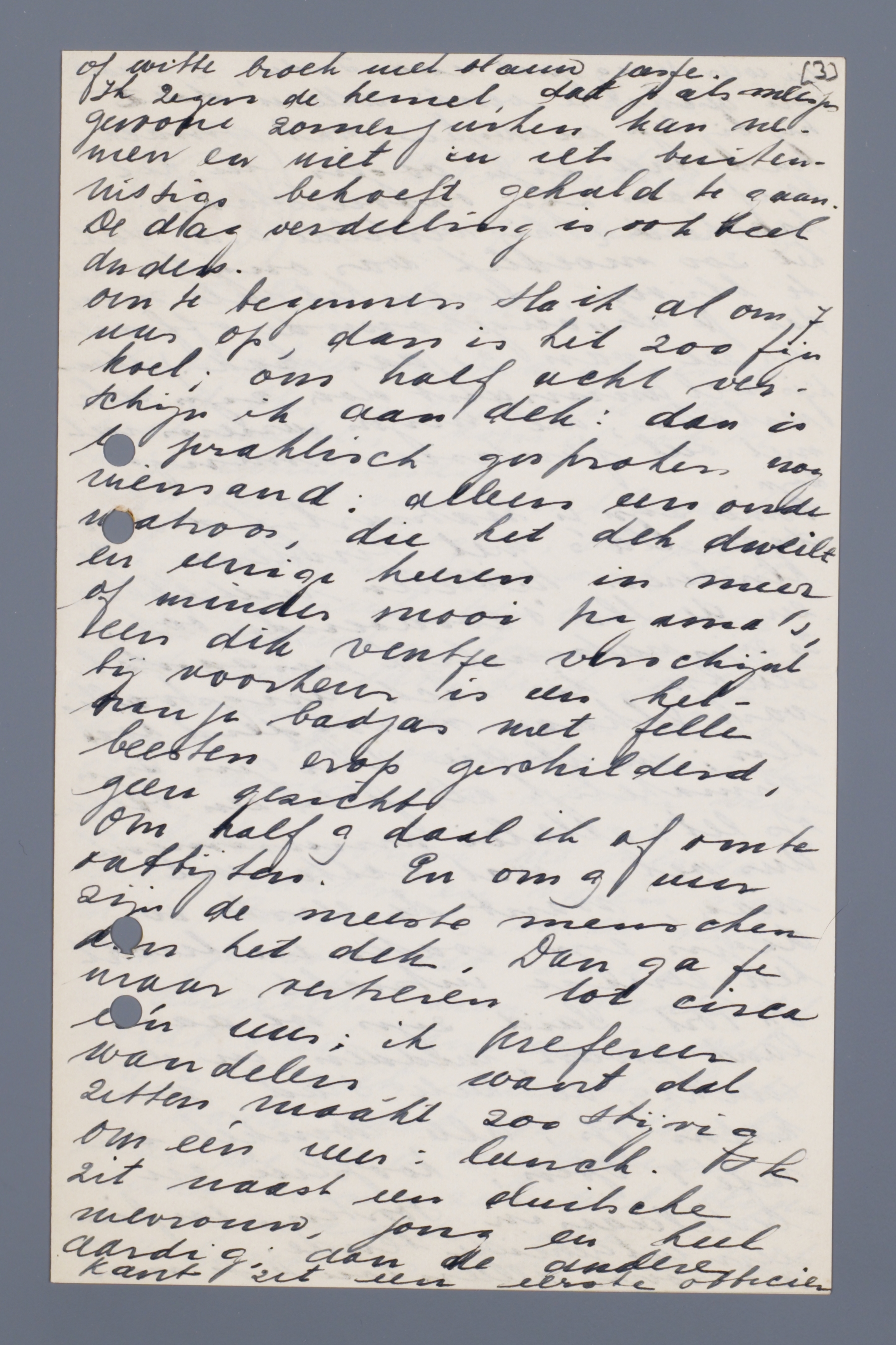 Om half 9 daal ik af om te ontbijten. En om 9 uur zijn de meeste menschen aan het dek. Dan ga je maar vertieren tot circa één uur; ik prefereer wandelen, want dat zitten maakt zoo stijvig. Om één uur: lunch. Ik zit naast een duitsche mevrouw, jong en heel aardig; aan de andere kant zit een eerste officier, een geschikte vent: alleen doet hij bij tijd en wijlen wat smachtend met zijn oogen, in het besef van zijn onweerstaanbaarheid (hij vertelde o.a. dat het zoo moeilijk was ongehouwd te blijven, gezien het vele succes dat je als ‘ongehouwde officier ter zee van 31 jaar’ had.). Maar hij is wel amusant door zijn vele verhalen, die mijns inziens wel met veel fantasie vermengd zijn.