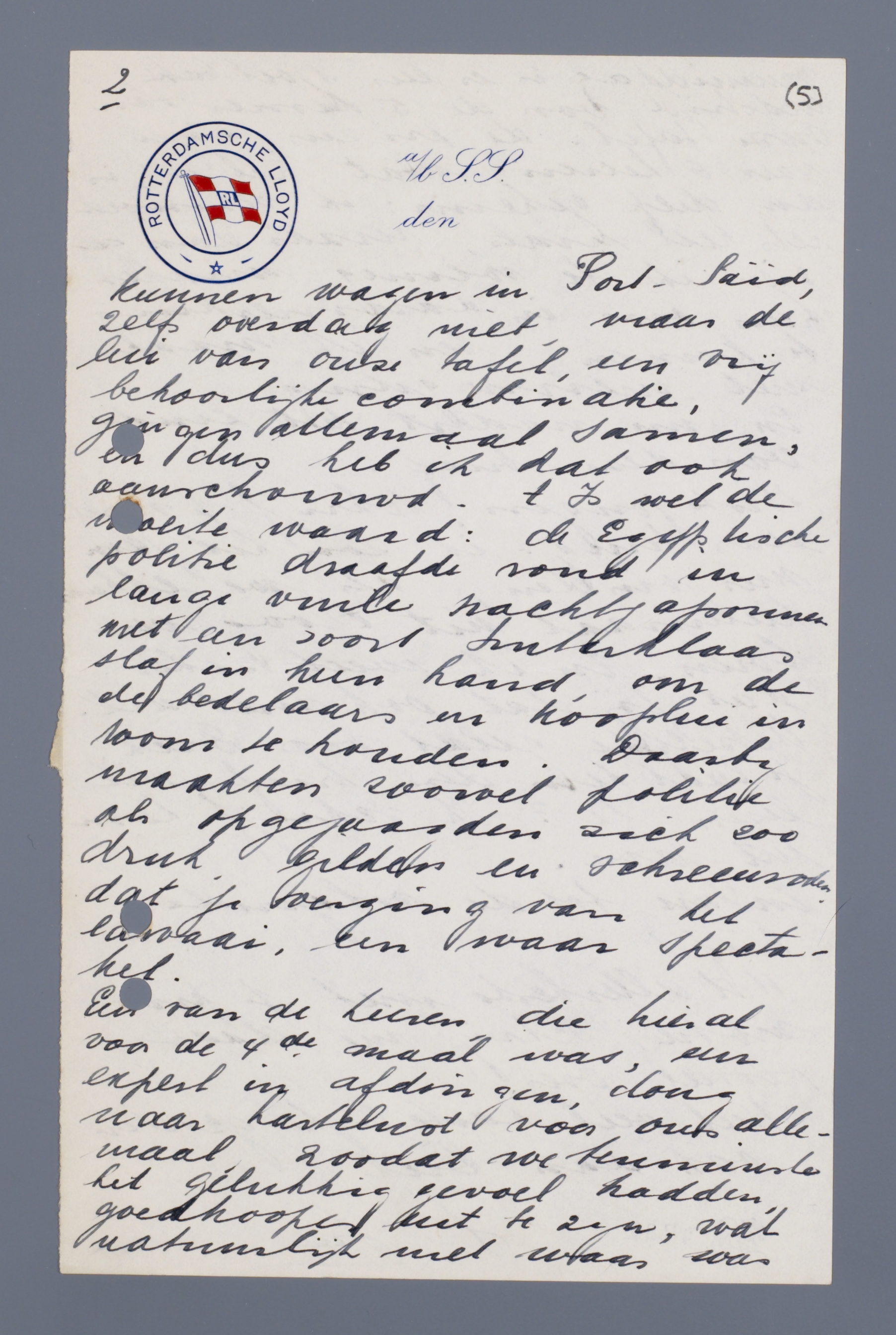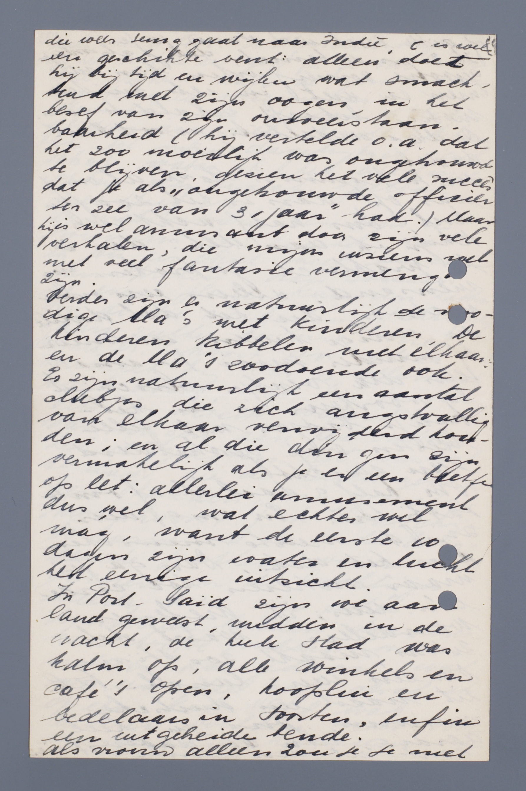 In Port-Saïd zijn we aan land geweest, midden in de nacht, de heele stad was kalm op, alle winkels en café's open, kooplui en bedelaars in soorten, enfin een uitgeheide bende. Als vrouw alleen zou je je niet kunnen wagen in Port-Saïd, zelfs overdag niet, maar de lui van onze tafel, een vrij behoorlijke combinatie, gingen allemaal samen, en dus heb ik dat ook aanschouwd. 't Is wel de moeite waard: de egyptische politie draafde rond in lange vuile nachtjaponnen met een soort Sinterklaas staf in hun hand, om de bedelaars en kooplui in toom te houden. Daarbij maakten zoowel politie als opgejaagden zich zoo druk, gilden en schreeuwden dat je verging van het lawaai, een waar spectakel