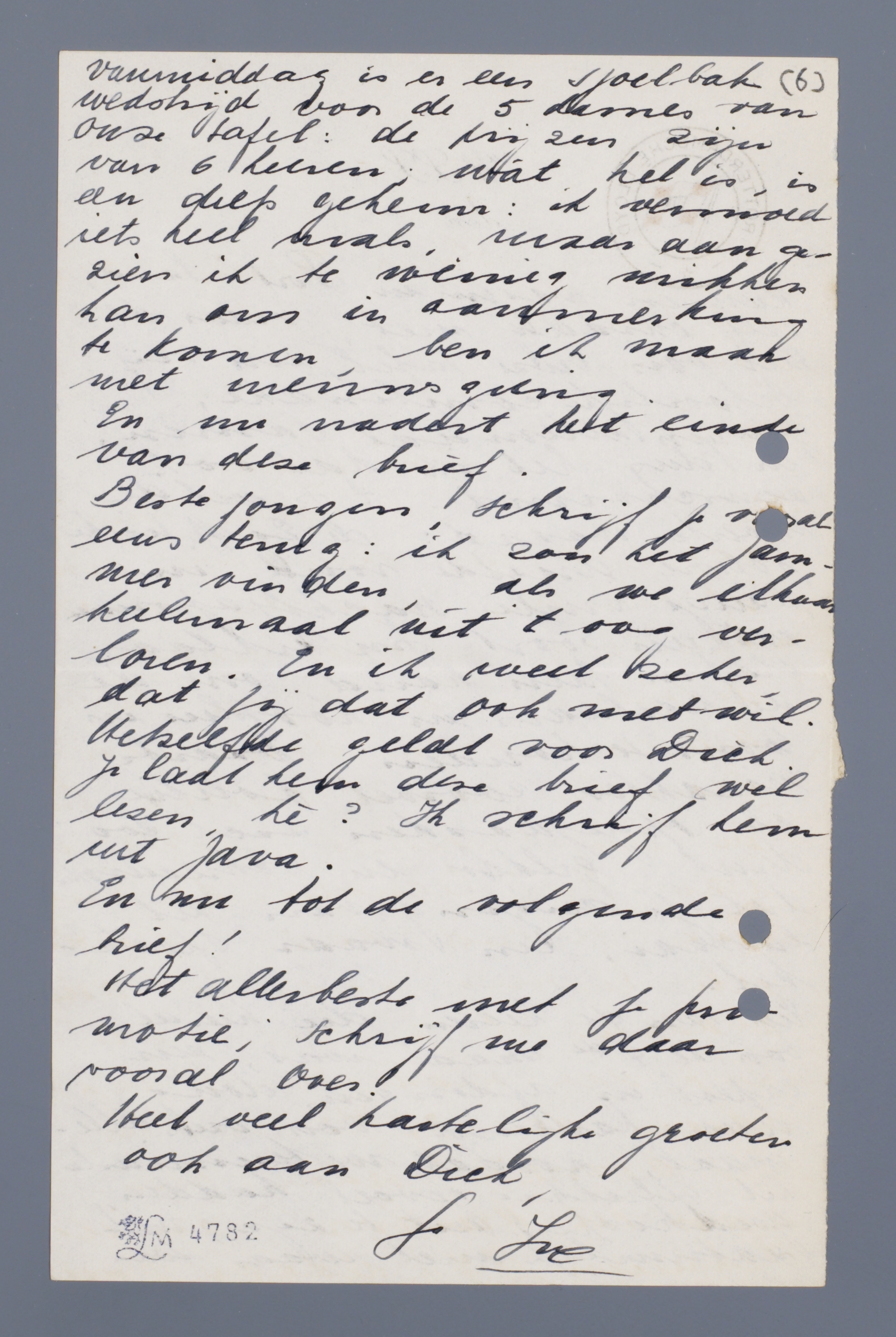Beste jongen, schrijf je vooral eens terug: ik zou het jammer vinden, als we elkaar heelemaal uit het oog verloren. En ik weet zeker dat jij dat ook niet wil. Hetzelfde geldt voor Dick. Je laat hem deze brief wel lezen, hè? Ik schrijf hem uit Java.