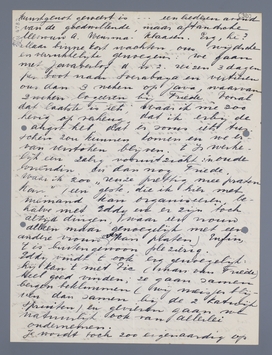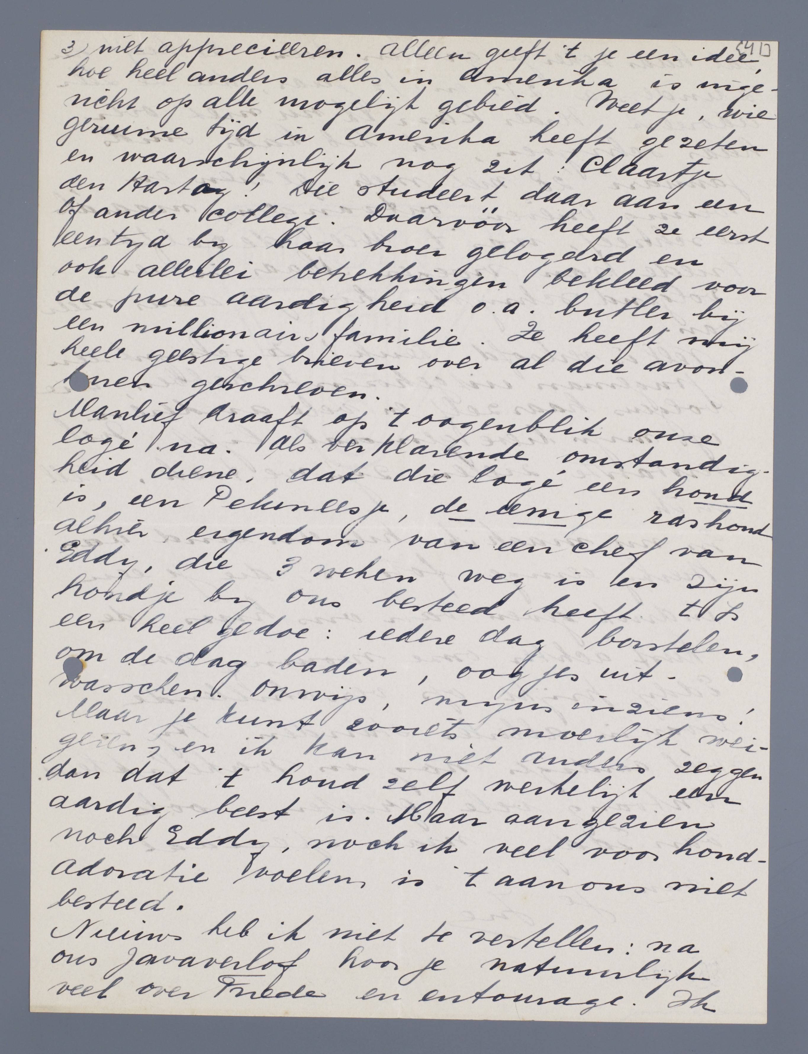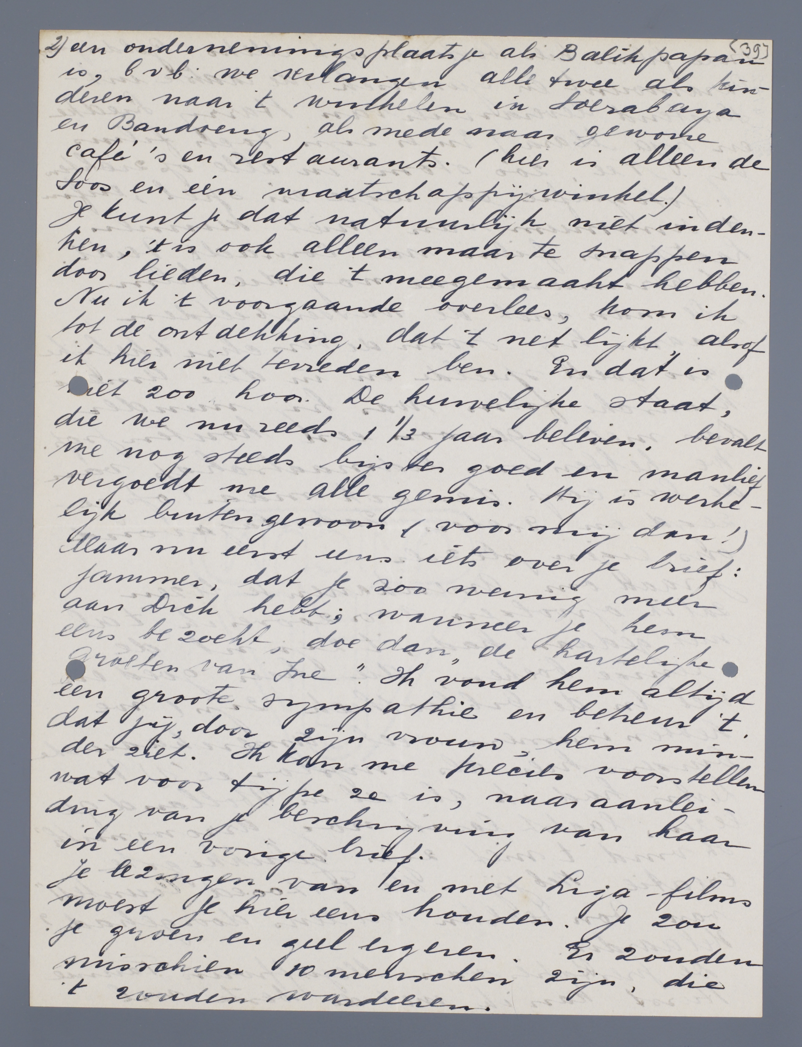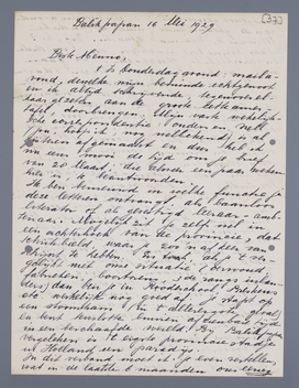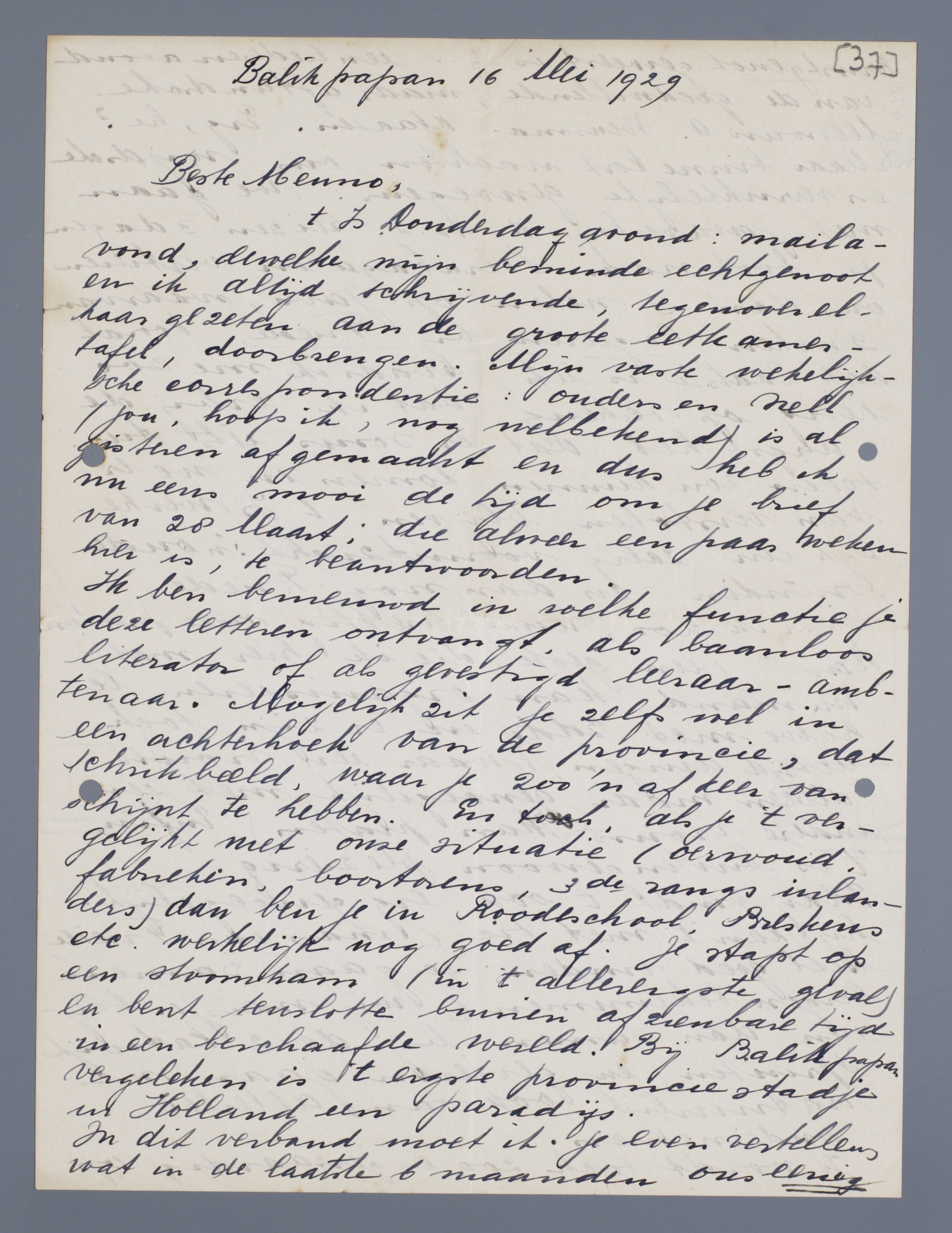 Ik ben benieuwd in welke functie je deze letteren ontvangt, als baanloos literator of als gevestigd leeraar - ambtenaar. Mogelijk zit je zelfs wel in een achterhoek van de provincie, dat schrikbeeld, waar je zoo'n afkeer van schijnt te hebben. En toch, als je 't vergelijkt met onze situatie (oerwoud, fabrieken, boortorens, 3e rangs inlanders) dan ben je in Roodeschool, Breskens etc. werkelijk nog goed af. Je stapt op een stoomtram (in 't allerergste geval) en bent tenslotte binnen afzienbare tijd in een beschaafde wereld. Bij Balik Papan vergeleken is 't ergste provinciestadje in Holland een paradijs.