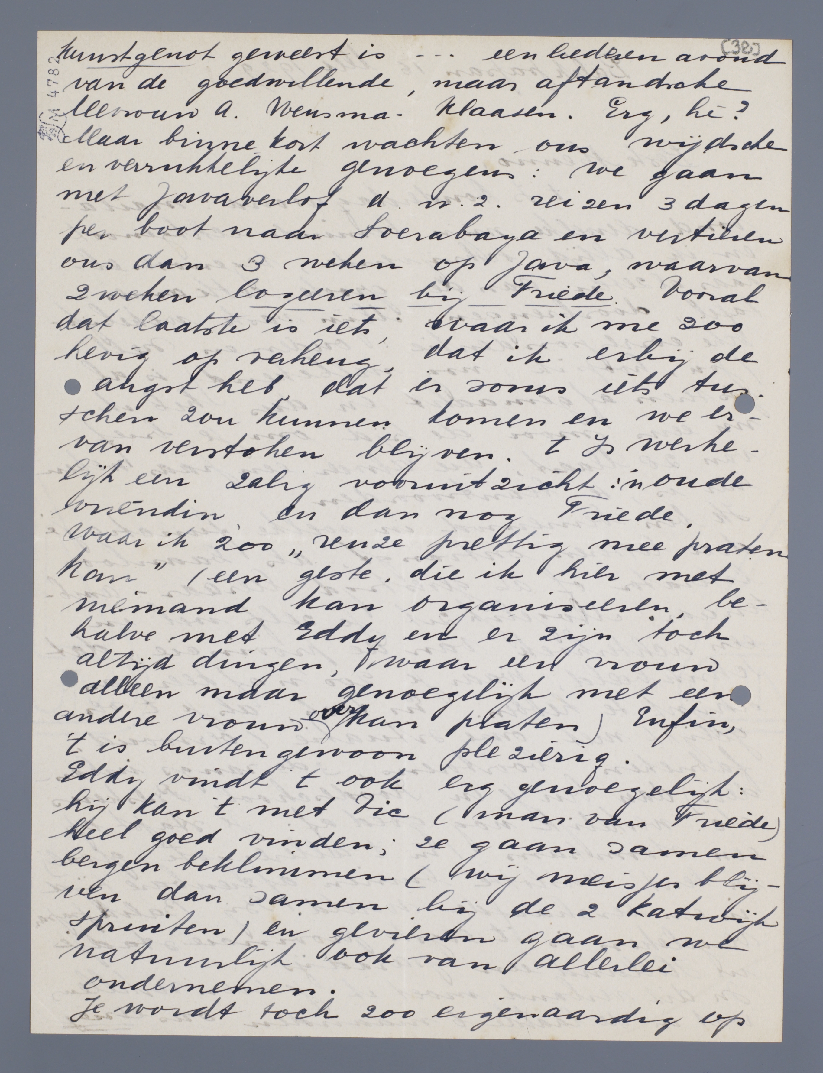 In dit verband moet ik je even vertellen, wat in de laatste 6 maanden ons eenig kunstgenot geweest is... een liederenavond van de goedwillende, maar aftandsche Mevrouw A. Wensma-Klaasen. Erg, hè? Maar binnen kort wachten ons wijdsche en verrukkelijke genoegens: we gaan met Javaverlof d.w.z. reizen 3 dagen per boot naar Soerabaja en vertieren ons dan 3 weken op Java, waarvan 2 weken logeeren bij Friede. Vooral dat laatste is iets, waar ik me zoo hevig op verheug, dat ik erbij de angst heb, dat er soms iets tusschen zou kunnen komen en we ervan verstoken blijven. 't Is werkelijk een zalig vooruitzicht: 'n oude vriendin, en dan nog Friede, waar ik zoo ‘reuze prettig mee praten kan’ (een geste, die ik hier met niemand kan organiseeren, behalve met Eddy en er zijn toch altijd dingen, waar een vrouw alleen maar genoegelijk met een andere vrouw over kan praten). Enfin, 't is buitengewoon plezierig.