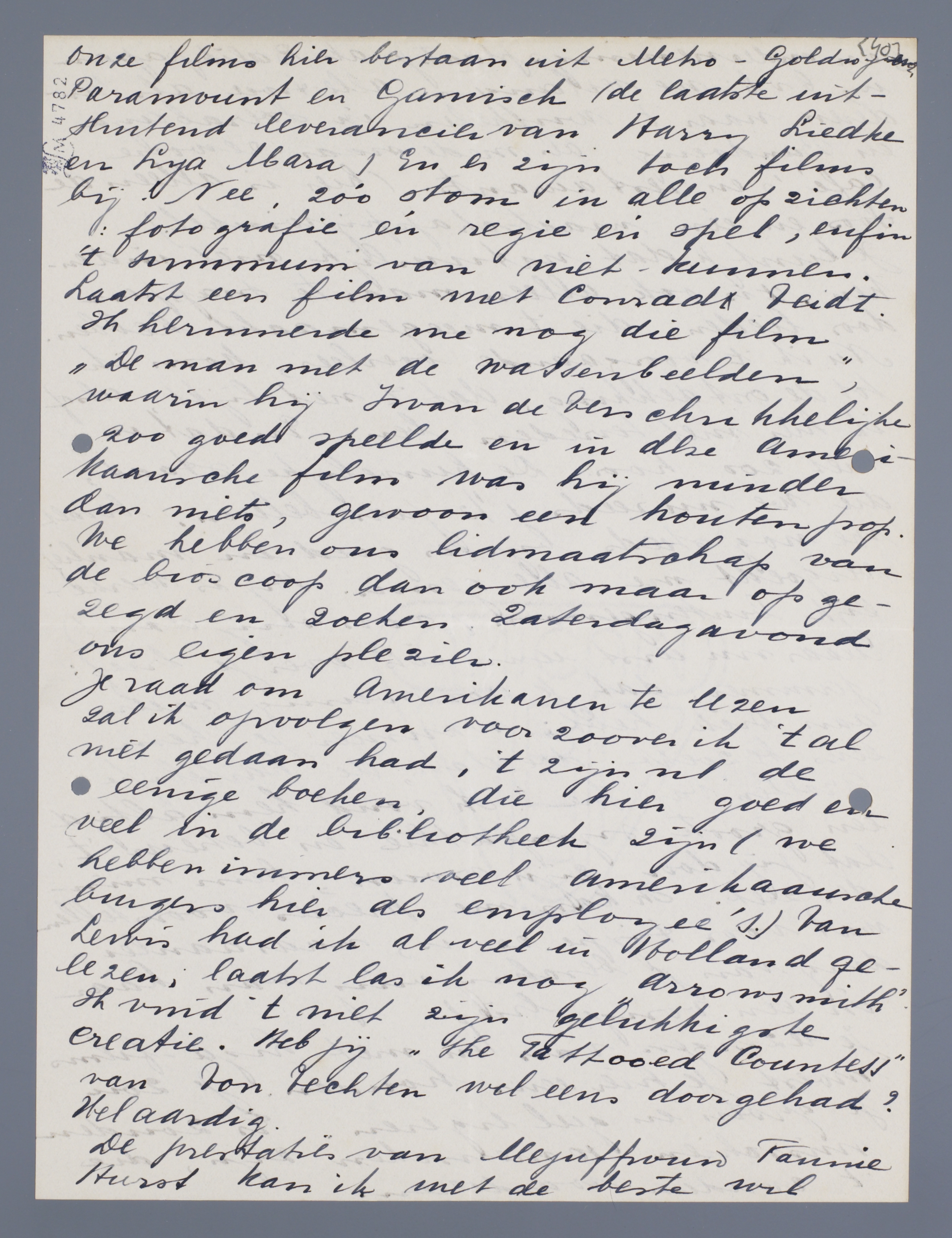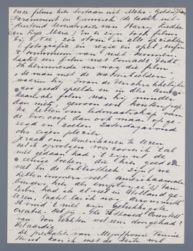 Je lezingen van en met Liga-films moest je hier eens houden. Je zou je groen en geel ergeren. Er zouden misschien 10 menschen zijn, die 't zouden waardeeren. Onze films hier bestaan uit Metro-Goldwyn-M., Paramount en Gamisch (de laatste uitsluitend leverancier van Harry Liedke en Lya Mara). En er zijn toch films bij! Nee, zóo stom in alle opzichten: fotografie én regie én spel, enfin 't summum van niet-kunnen. Laatst een film met Conradt Veidt. Ik herinnerde me nog die film ‘De man met de wassenbeelden’, waarin hij Iwan de verschrikkelijke zoo goed speelde en in deze Amerikaansche film was hij minder dan niets, gewoon een houten pop. We hebben ons lidmaatschap van de bioscoop dan ook maar opgezegd en zoeken zaterdagavond ons eigen plezier.