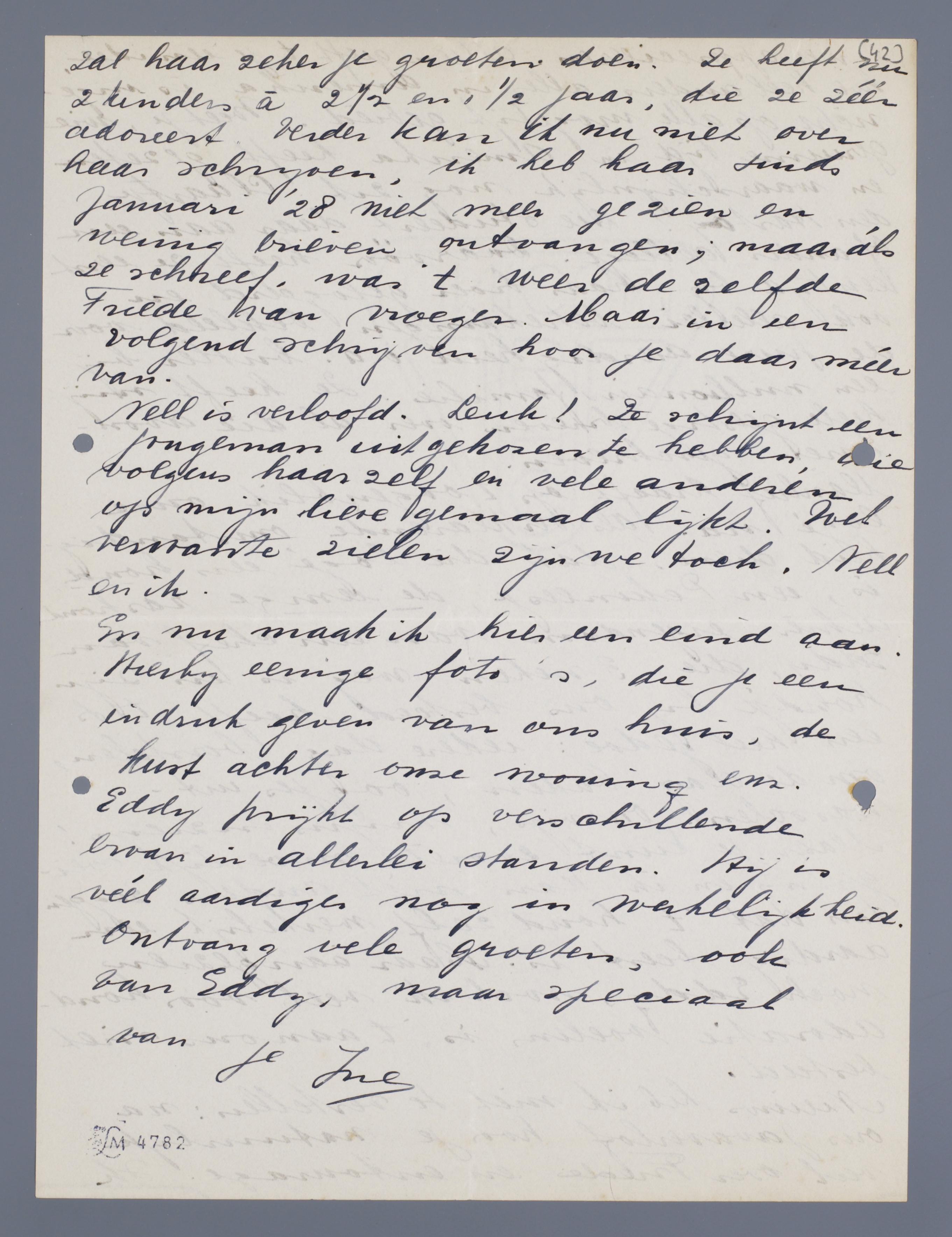 Nieuws heb ik niet te vertellen: na ons Javaverlof hoor je natuurlijk veel over Friede en entourage. Ik zal haar zeker je groeten doen. Ze heeft nu 2 kinders à 2½ en 1½ jaar, die ze zéér adoreert. Verder kan ik nu niet over haar schrijven, ik heb haar sinds Januari '28 niet meer gezien en weinig brieven ontvangen, maar áls ze schreef, was 't weer dezelfde Friede van vroeger. Maar in een volgend schrijven hoor je daar méer van.