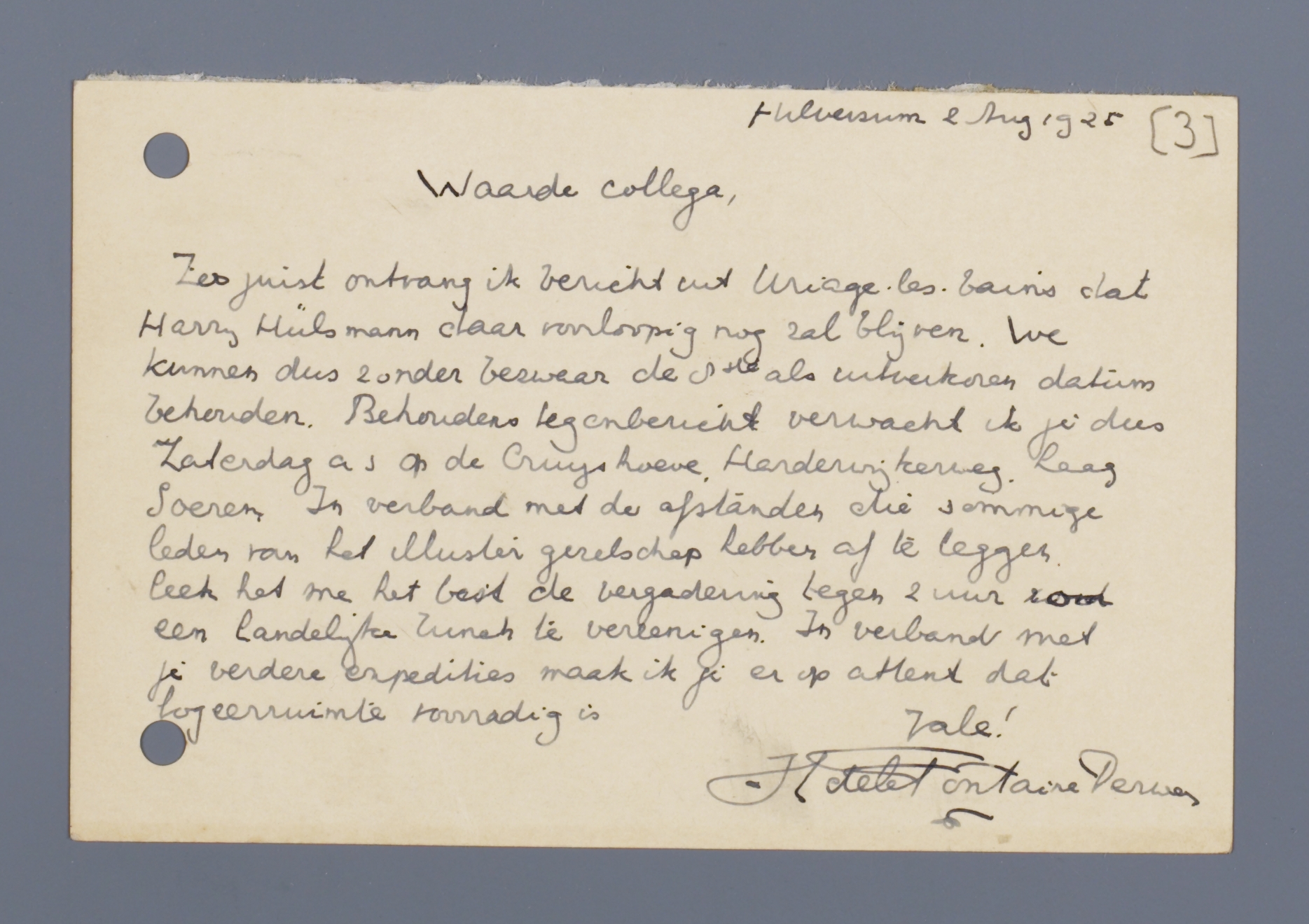 Zoo juist ontvang ik bericht uit Uriage-les-bains dat Harry Hülsmann daar voorloopig nog zal blijven. We kunnen dus zonder bezwaar de 8ste als uitverkoren datum behouden. Behoudens tegenbericht verwacht ik je dus Zaterdag a.s. op de Cruyshoeve, Harderwijkerweg, Laag Soeren. In verband met de afstanden die sommige leden van het illuster gezelschap hebben af te leggen, leek het me het best de vergadering tegen 2 uur rond een landelijke lunch te vereenigen. In verband met je verdere expedities maak ik je er op attent dat logeerruimte aanwezig is.