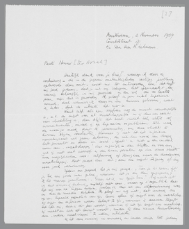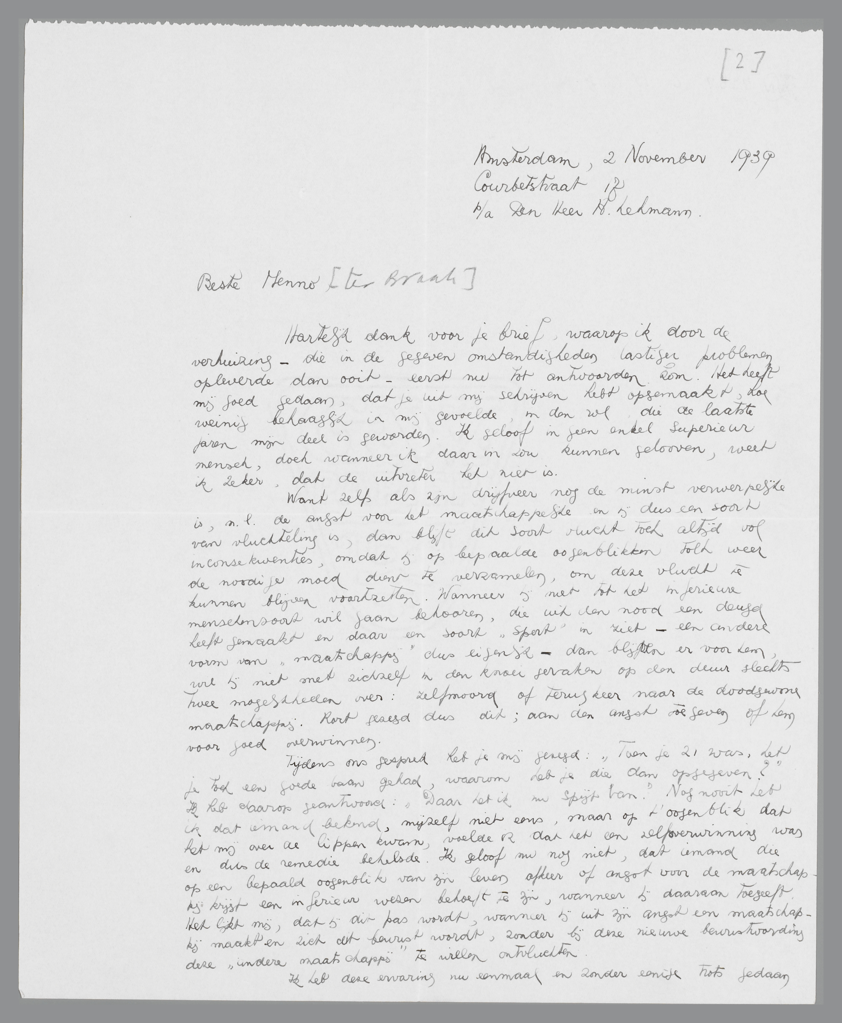 Nu wat het lijstje betreft! Eerlijk gezegd, zou ik werkelijk niet weten, wie ik daarop zou kunnen zetten. Het aantal menschen in Holland, dat mij zoo nu en dan geholpen heeft is zéér klein, althans voor zoover het een bedrag in de buurt van een tien gulden betreft. Het waren Du Perron, Greshoff, Binnendijk, Braat en jij. Ik ken natuurlijk nog wel andere menschen, maar voor hen is fl 1,- of fl 2,50 al zéér veel geld. Nu je mij deze vraag stelde, valt het mij op hoe weinig menschen ik de laatste tijd gezien en gesproken heb. Sinds de débacle met ‘Le Vice’ is dat er niet op vooruitgegaan.
