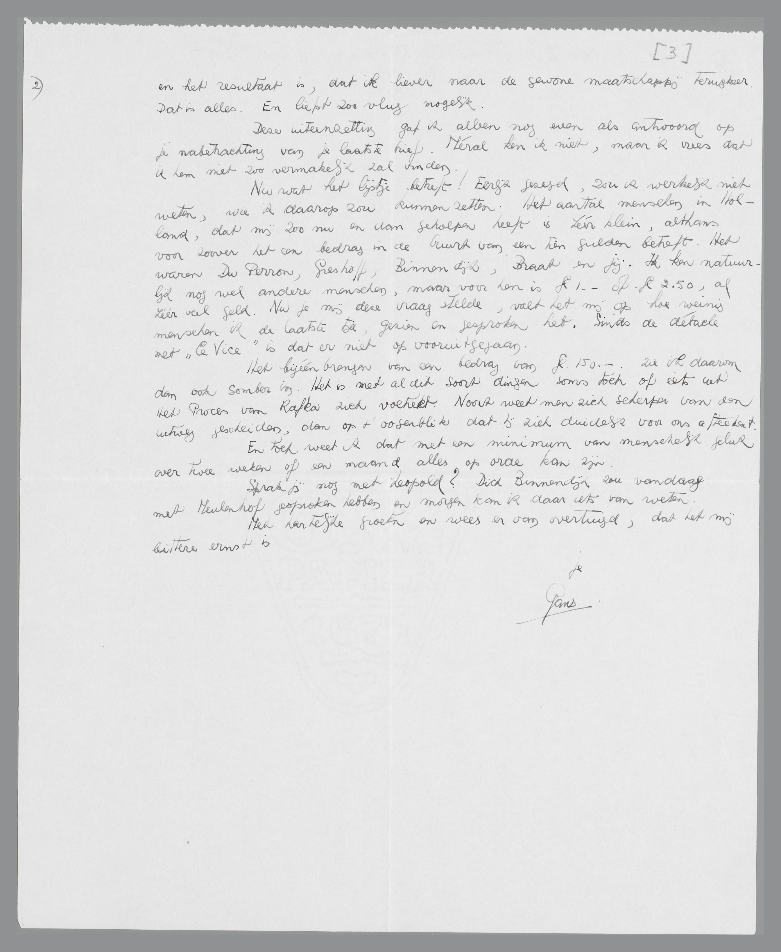 Het bijéénbrengen van een bedrag van fl 150,- zie ik daarom dan ook somber in. Het is met al dit soort dingen soms toch of iets uit Het Proces van Kafka zich voltrekt. Nooit weet men zich scherper van den uitweg gescheiden, dan op 't oogenblik dat hij zich duidelijk voor ons afteekent.