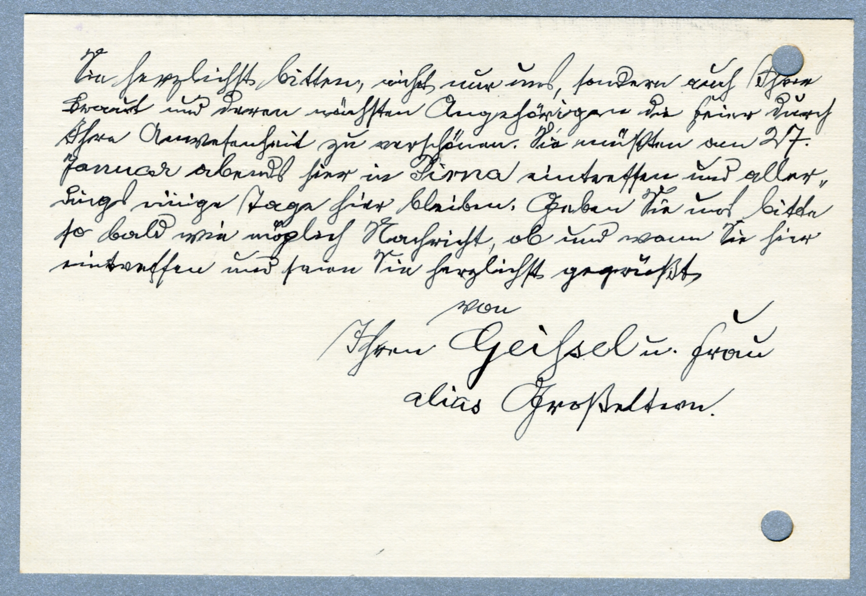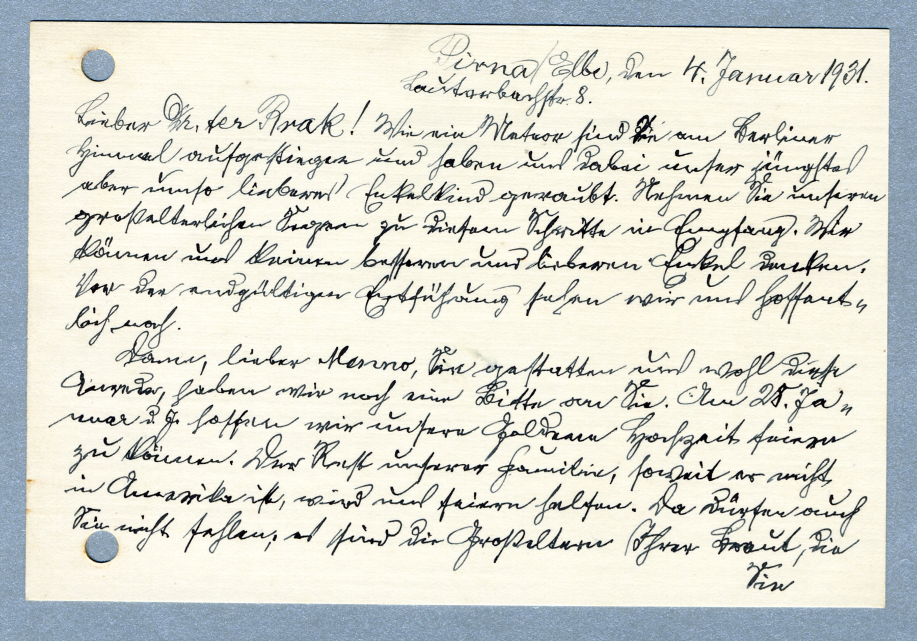 Dann, lieber Menno, Sie gestatten uns wohl diese Anrede, haben wir noch eine Bitte an Sie. Am 28. Januar d[ieses] J[ahres] hoffen wir unsere Goldene Hochzeit feiern zu können. Der Rest unserer Familie, soweit er nicht in Amerika ist, wird uns feiern helfen. Da dürfen auch Sie nicht fehlen; es sind die Groβeltern Ihrer Braut, die Sie herzlichst bitten, nicht nur uns, sondern auch Ihre Braut und deren nächsten Angehörigen die Feier durch Ihre Anwesenheit zu verschönen. Sie müβten den 27. Januar abends hier in Pirna eintreffen und allerdings einige Tage hier bleiben. Geben Sie uns bitte so bald wie möglich Nachricht, ob und wann Sie hier eintreffen und seien Sie herzlichst gegrüβt