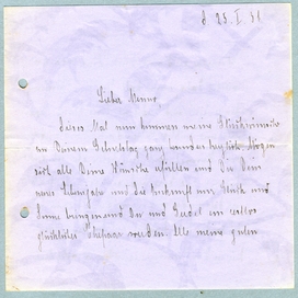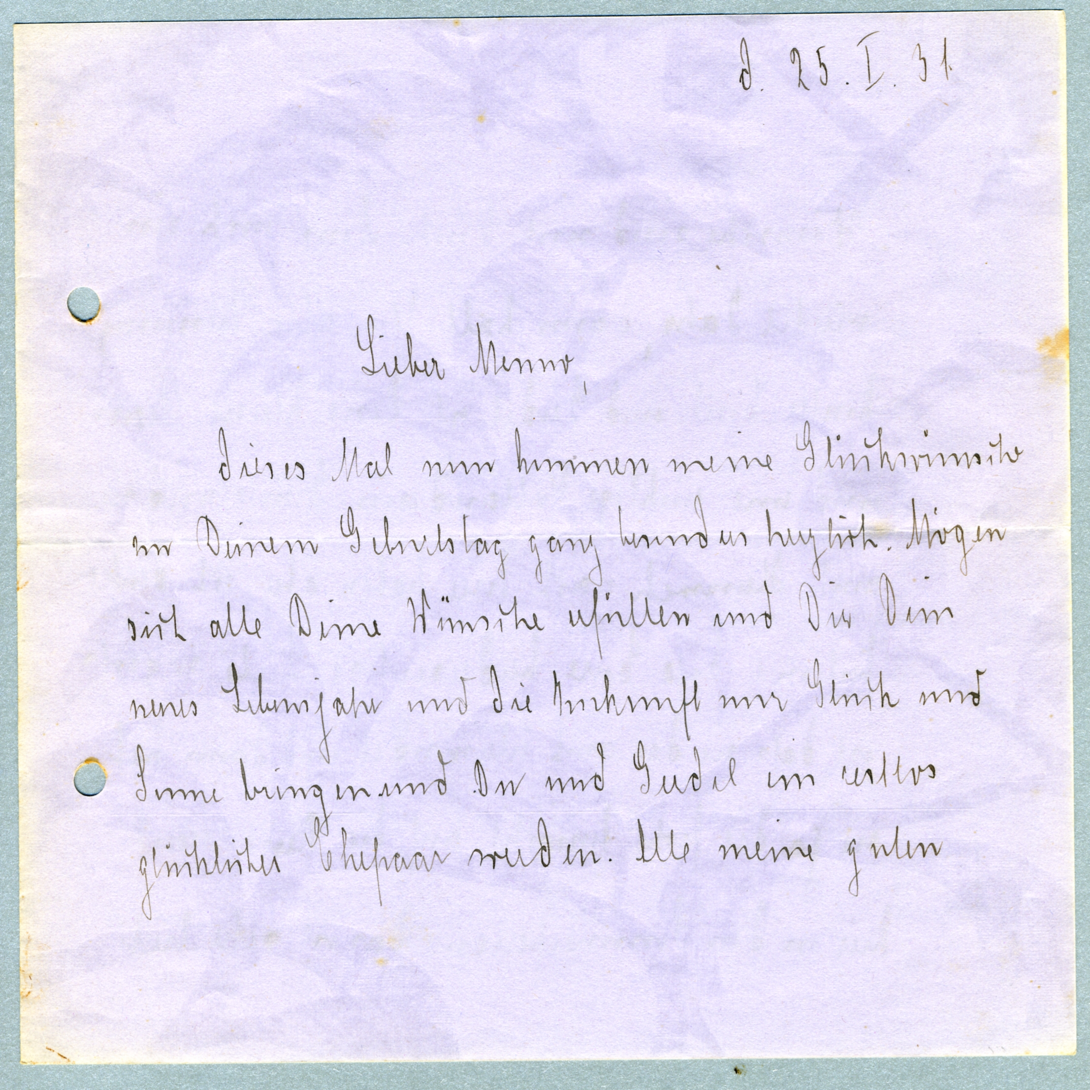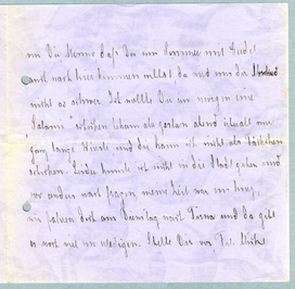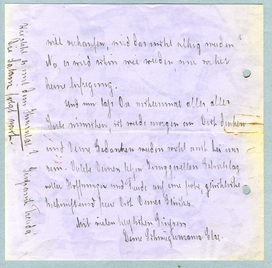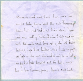 Und nur lass Dir noch einmal alles, alles Gute wünschen, ich werde morgen an Dich denken und Deine gedanken werden wohl auch bei uns sein. Verlebe Deinen letzten[?] Jungegesellen Geburtstag voller Hoffnungen und Freude auf eine frohe, glückliche Zukunft und freue Dich Deines Glückes.