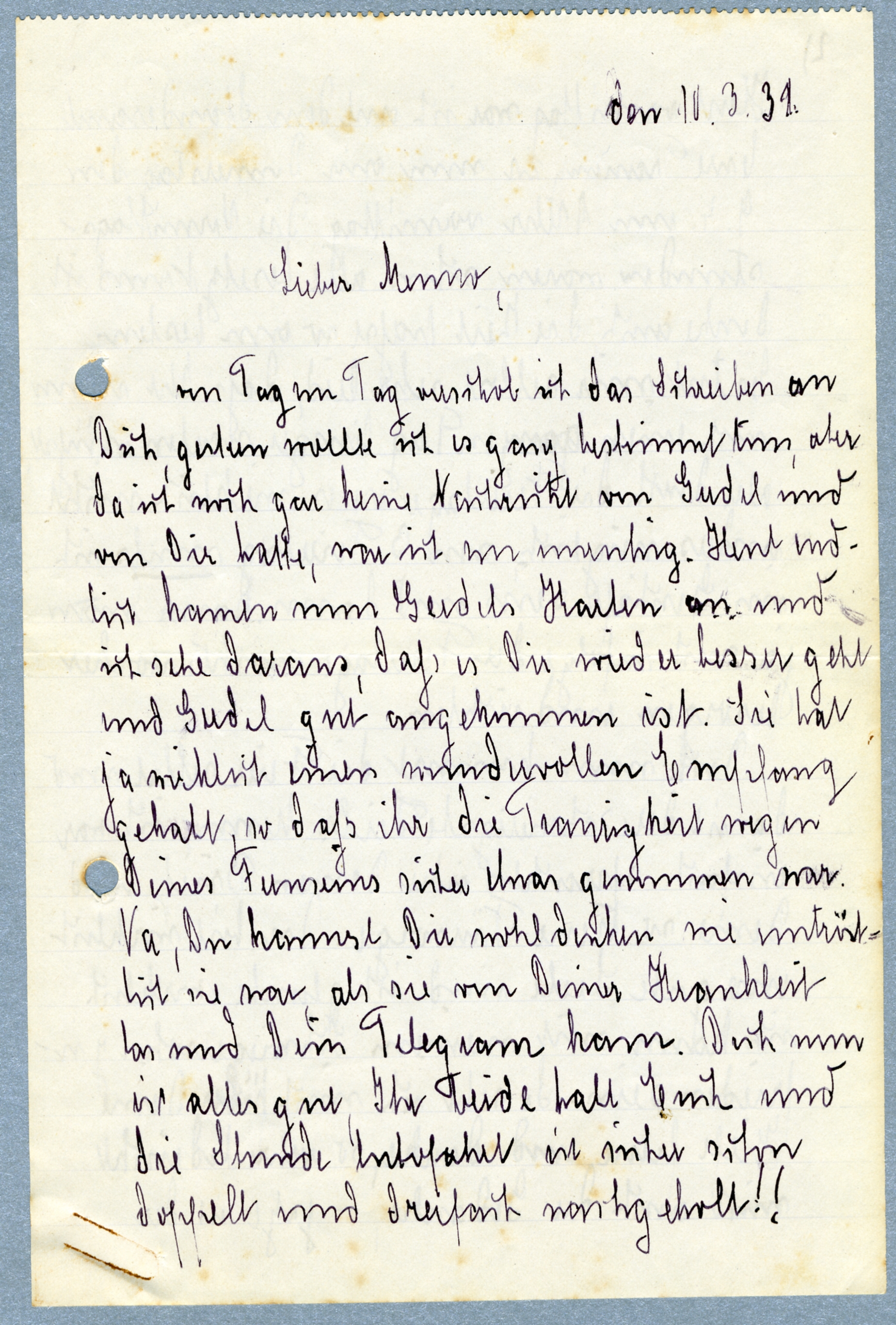 von Tag zu Tag verschob ich das schreiben an Dich, gestern wollte ich es ganz bestimmt tun, aber da ich noch gar keine Nachricht von Gerdel und van Dir hatte, war ich nur unruhig. Heute endlich kamen nun Gerdels Karten an und ich sehe daraus, dass es Dir wieder besser geht und Gerdel gut angekommen ist. Sie hat ja wirklich einen wundervollen Emppfang gehabt, so dass ihr die Traurigkeit wegen Deines [Fxxxx] sicher etwas genommen war. Na, Du kannst Dir wohl denken wie untröstlich sie war als sie von Deiner Krankheit las und Dein Telegram kam. Doch nur ist alles gut, Ihr beide hat Euch und die Stunde [xxxx] ist sicher schon doppelt und dreifach nachgehollt!!